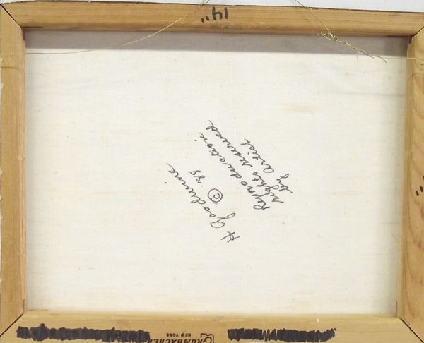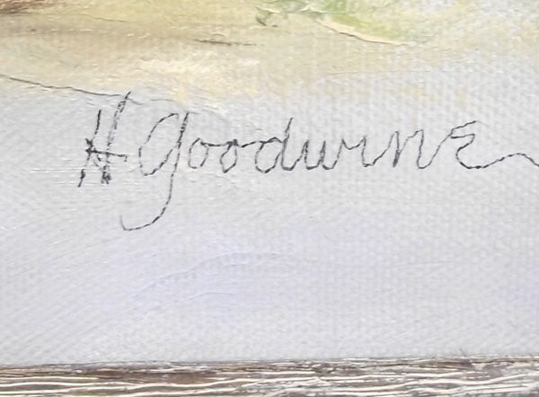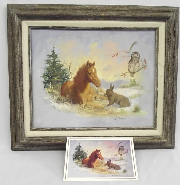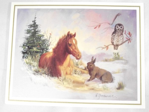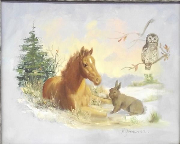 1988 Acrylic Horse Rabbit - Hildred Goodwine (1918-98). Measures 10.5''H x 13.5''W. In a wooden frame, this painting of a foal, rabbit and owl is called ''Summit Meeting''. It is featured as the cover on a ''Leaning Tree'' greeting card, which is included with the painting. The charming paintings by artist Hildred Goodwine portray scenes rich with harmony and happiness. It is not at all unusual to find cats, dogs, chickens, horses--an entire bevy of barnyard and domestic animals--peacefully together in one scene. Although she loved all animals and paints and sculpted them with equal enthusiasm, Hildred's favorite subject was horses--horses of all sizes, shapes and breeds. Born in Michigan, her life on the farm there and experiences on ranches in Kansas and Arizona later in life gave her lasting memories that provided her with ample inspiration for her paintings. Hildred often chose animals from her own menagerie for models and in a very special way successfully captured the individual personality and beauty of each subject. (Source: Information provided by Gary Lasko as posted on Ask Art). Many of Goodwine's paintings can be found on ''Leaning Tree'' greeting cards and the covers of ''Western Horseman'' magazines.