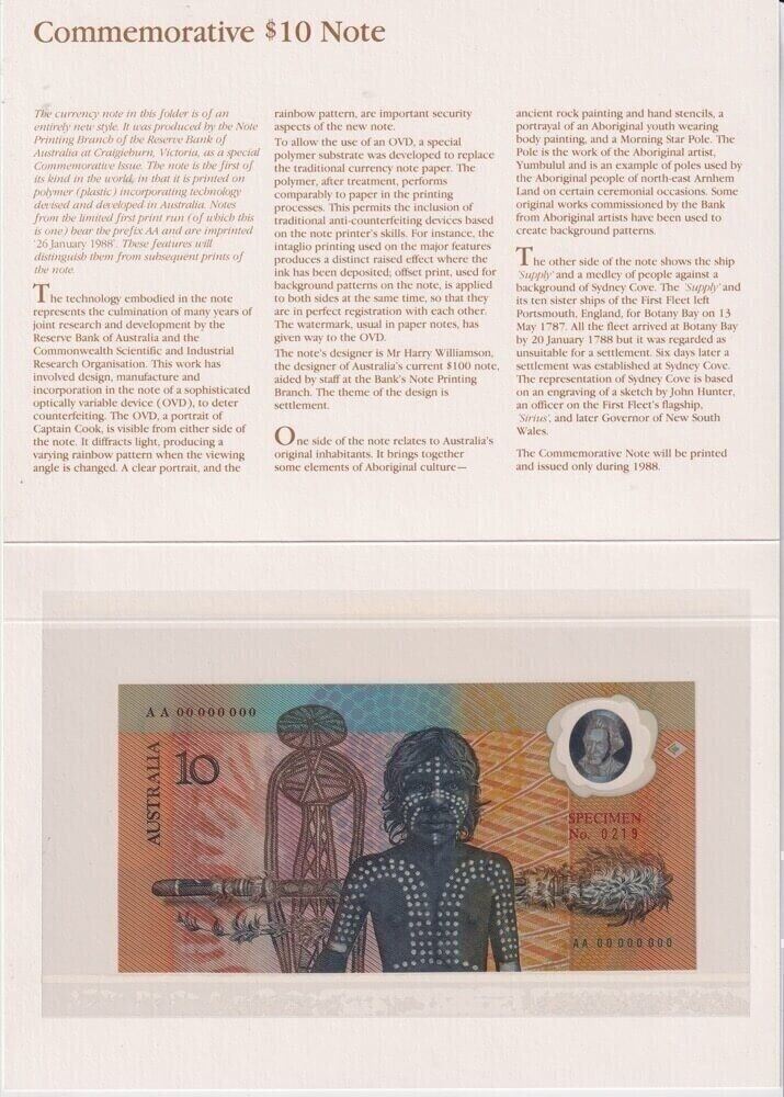 1988 Australia $10 BICENTENNIAL COMMEMORATIVE POLYMER PLASTIC Note W Original Folder