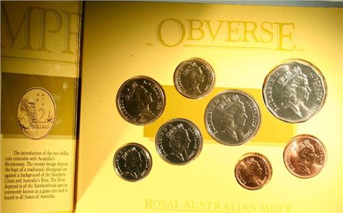 Issued by the Royal Australian Mint this eight piece coin set commemorates Australia's Bicentennial year and features the new designs for both the one dollar and fifty cent coins. Also included for the first time is the distinctive new Two Dollar coin which replaced the $2.00 note. In original colorful yellow pictorial folder.