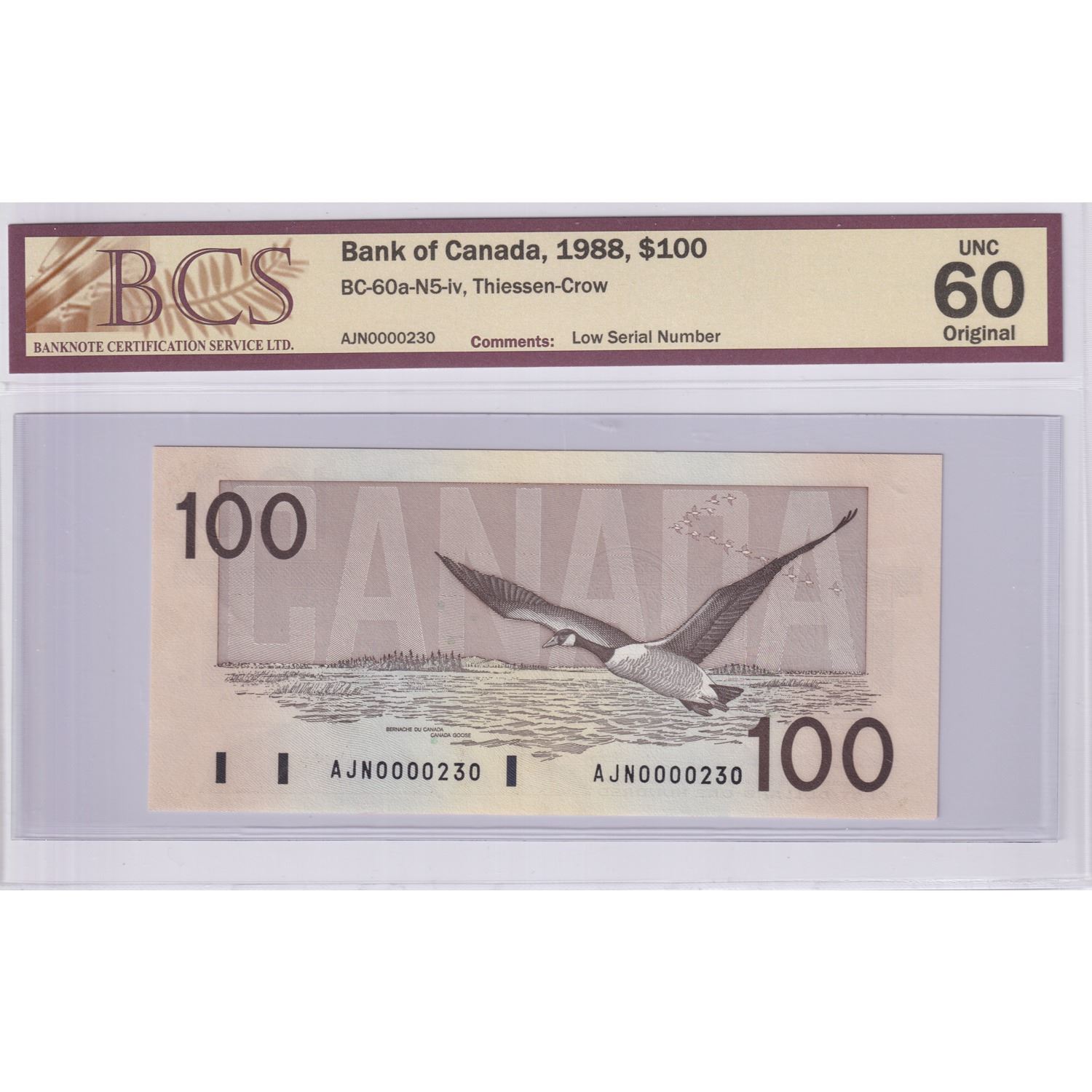 1988 BC-60a-N5-iv $100, Bank of Canada, Thiessen-Crow, Low Serial Number AJN0000230, BCS Certified UNC-60 Original.