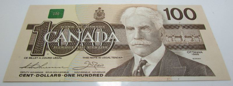 1988 Bank Of Canada $100 Bank Note - UNC Condition - Thiessen/Crow Signatures, AJS Serial -- Boke Value $250