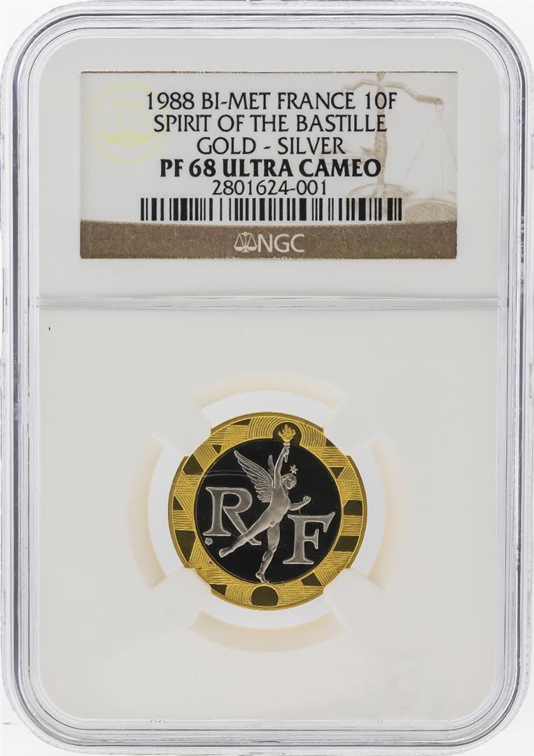 One 1988 Bi-Met France 10F Gold-Silver Coin NGC PF68 Ultra Cameo. NGC Certified.