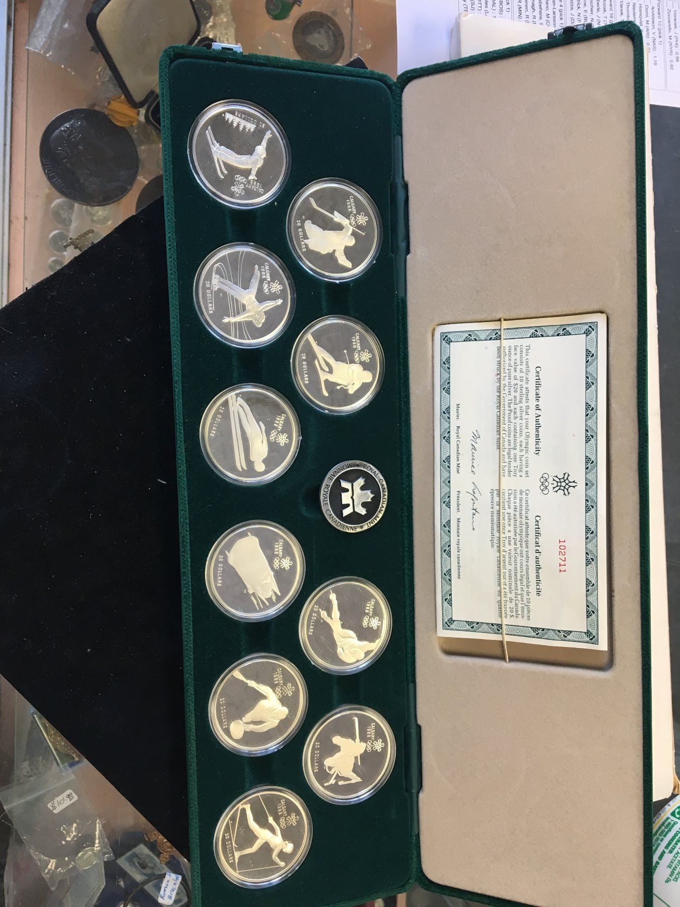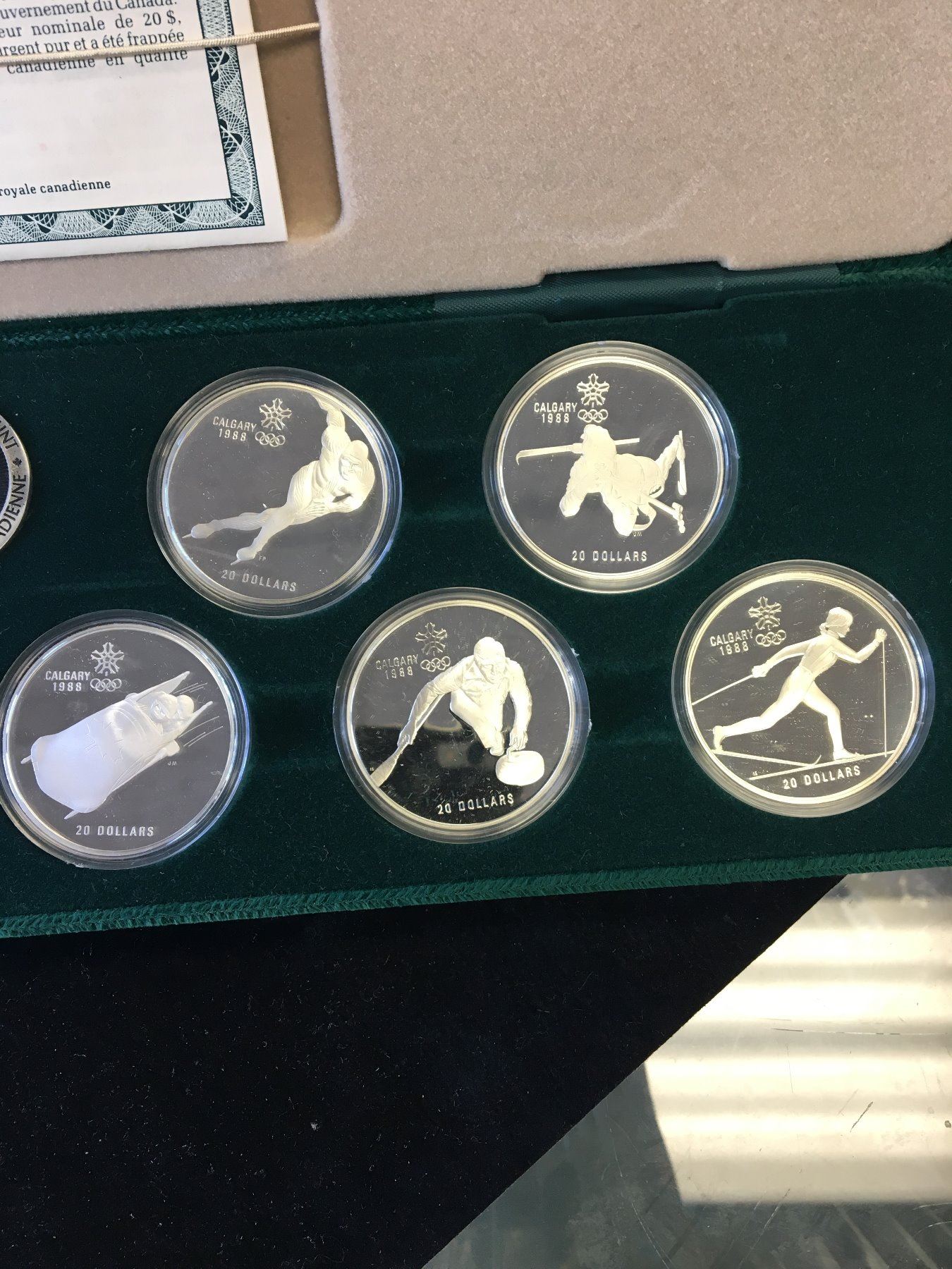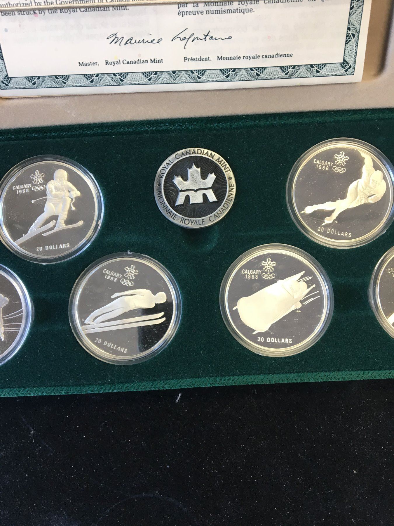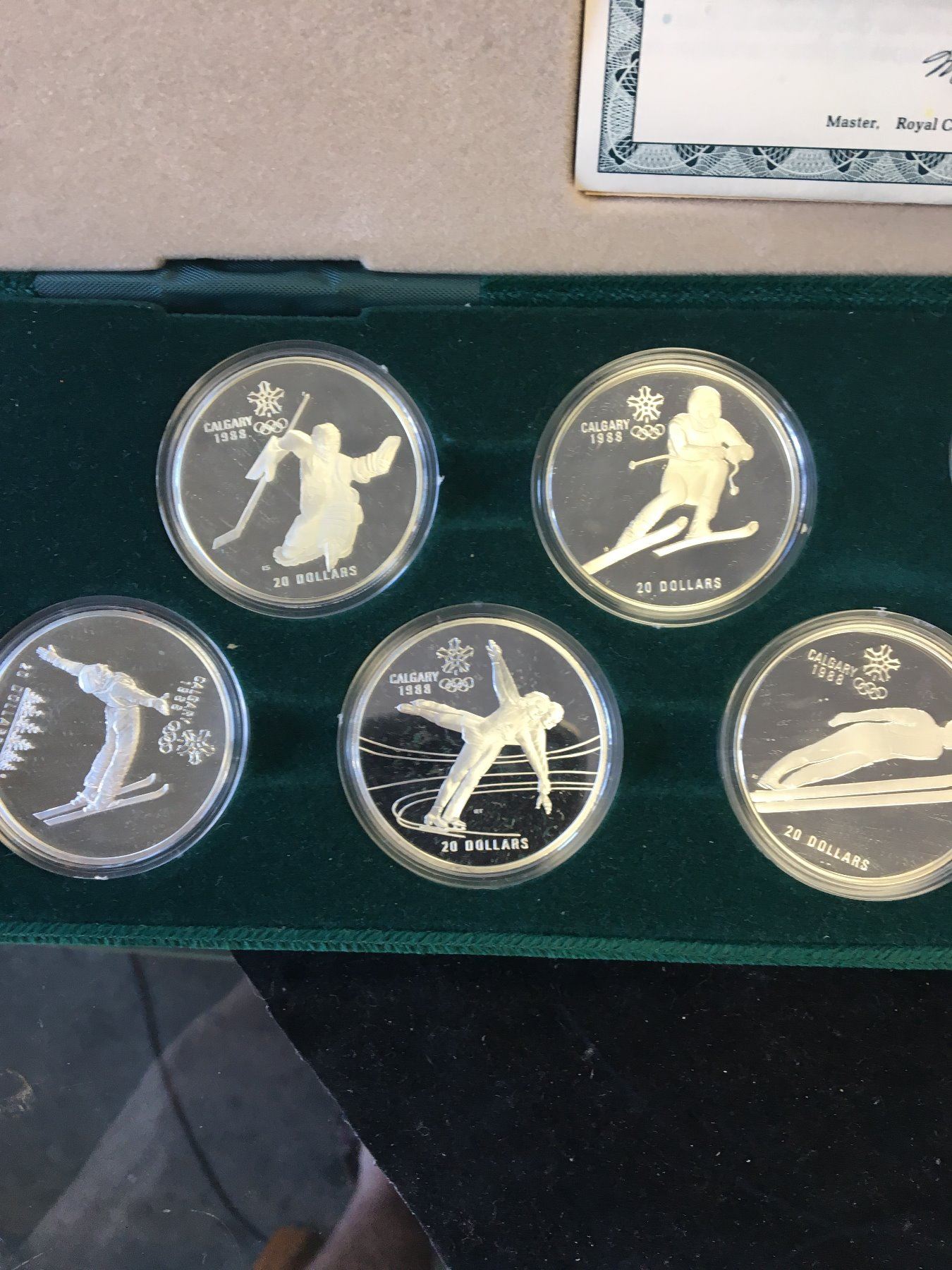 NICE COMPLETE SET OF CALGARY OLYMPIC $20 SILVER COINS! IN SPECIAL CASE WITH COA,S FOR ALL COINS AND MAGNIFYING GLASS! GREAT SET,ALL COINS HAVE THE EDGE LETTERING!