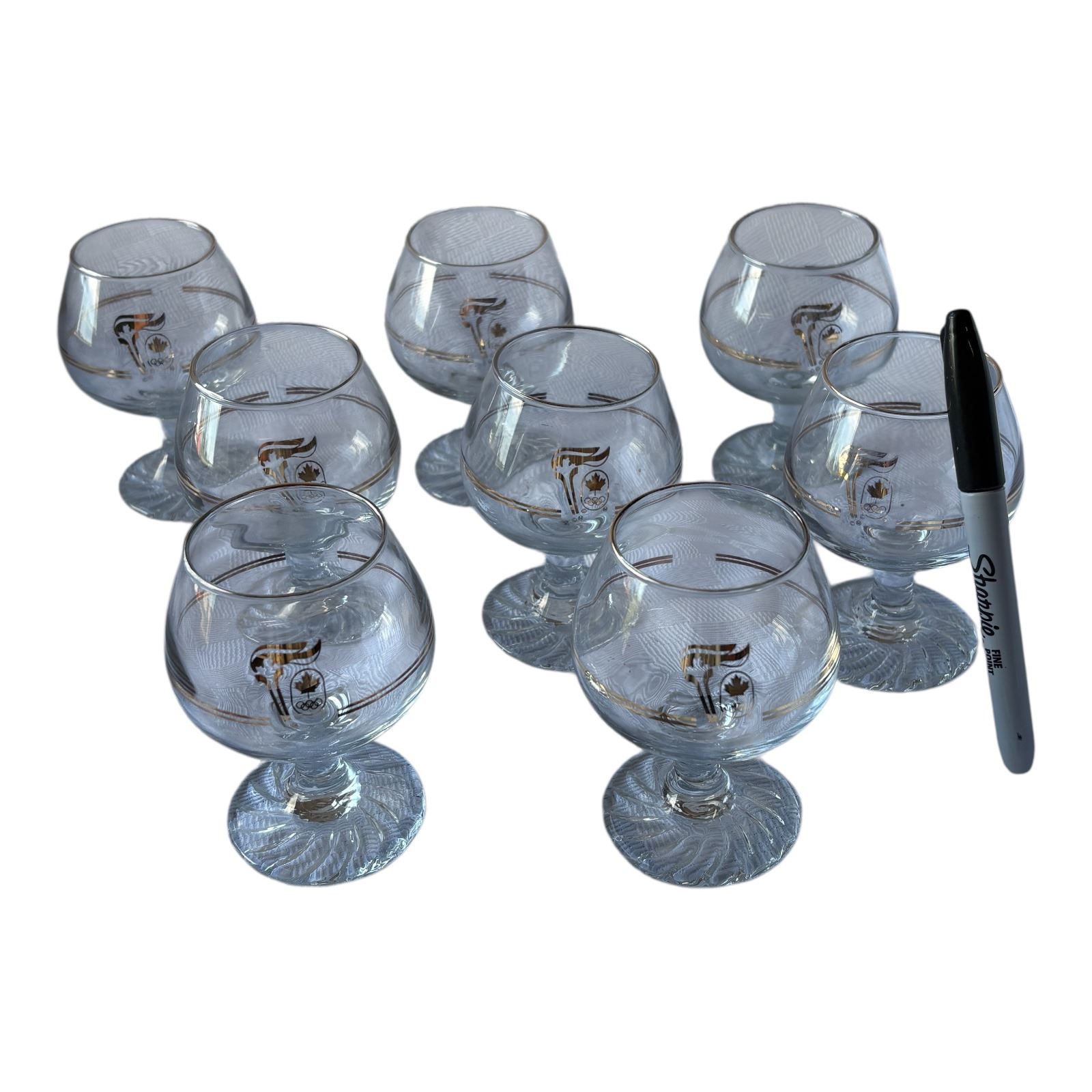 Petro-Canada - commemorating Olympic Torch Relay - 8 glasses included - rimmed and accents in 22k gold - 4.25 inches tall - marker not included only for size comparison