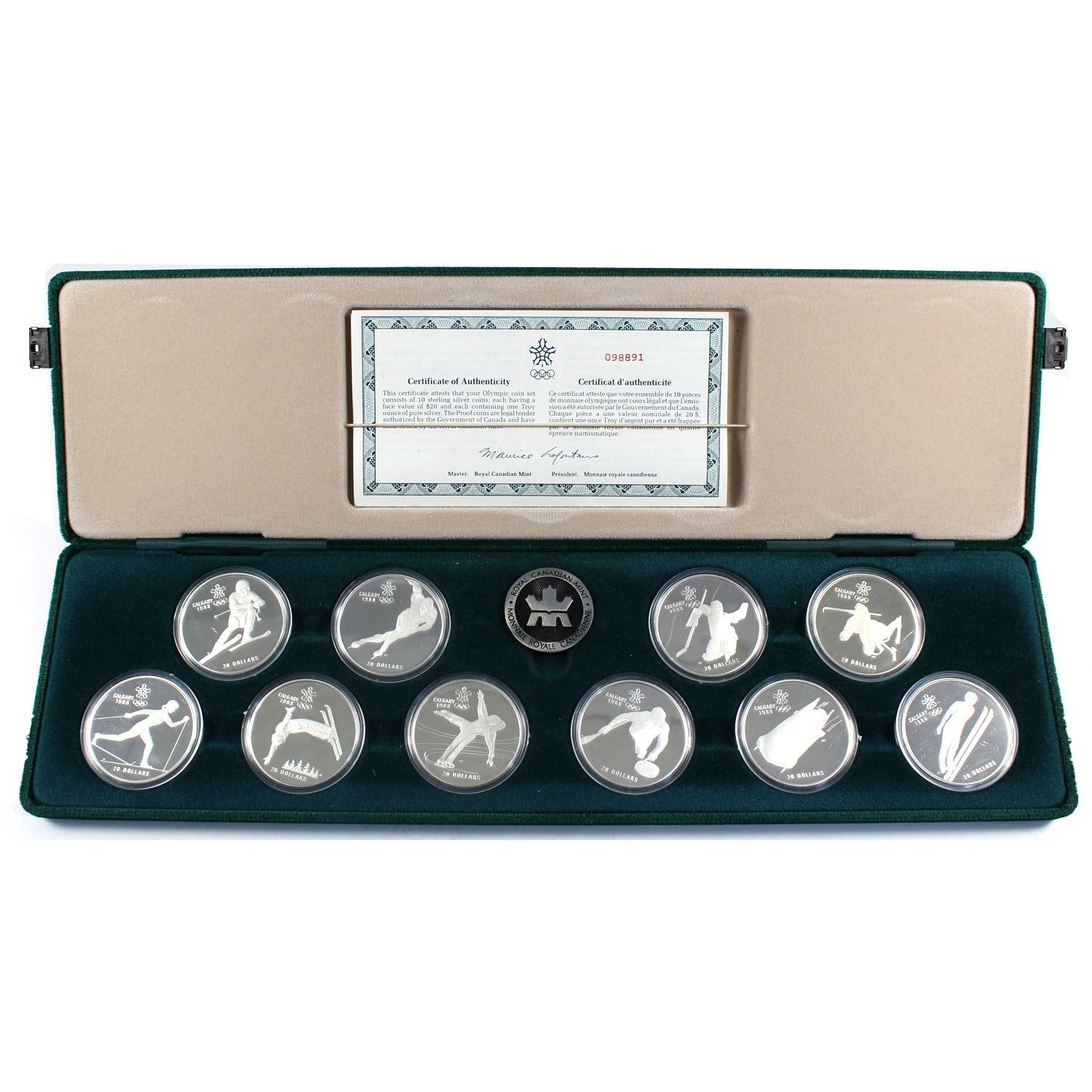 1988 Canada $20 Calgary Olympics 10-coin Sterling Silver Set in Original Green Felt Display Case with COA (capsules contain scratches). Each coin contains 1oz Fine Silver.