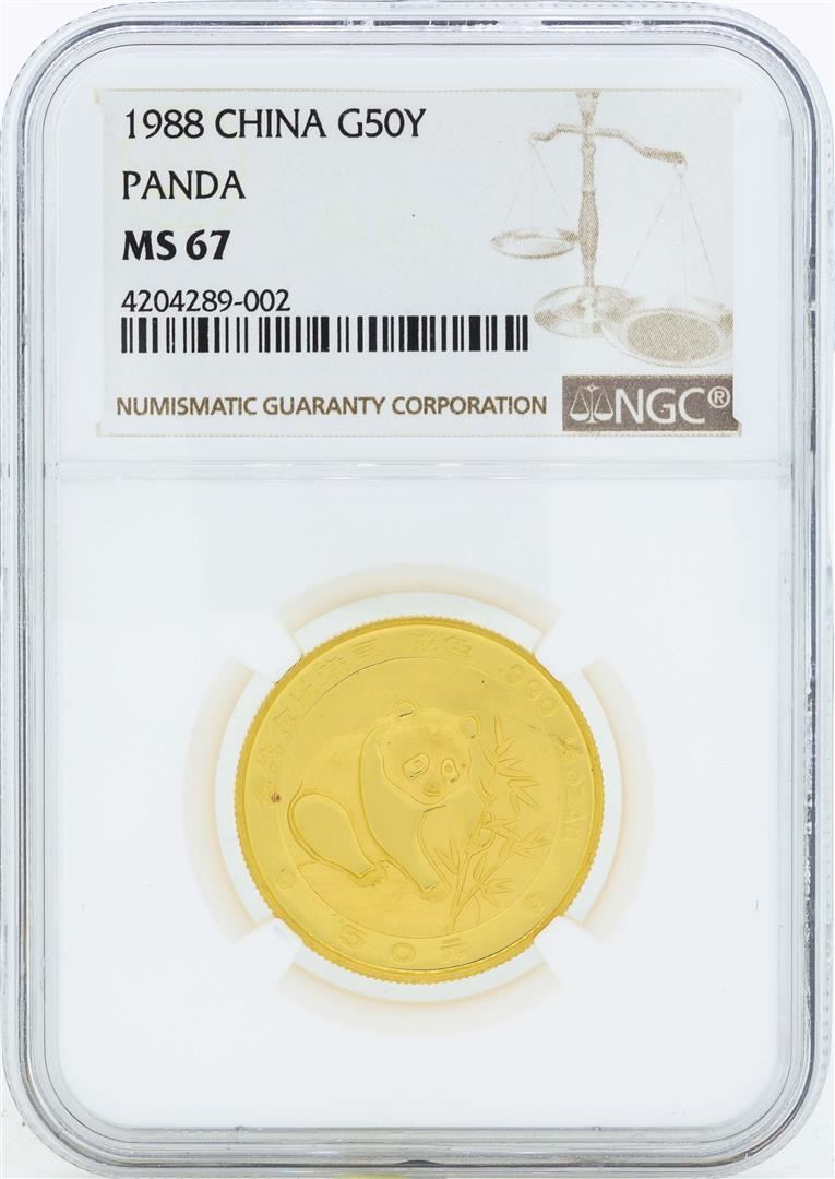 One 1988 China 50 Yuan Gold Panda Coin NGC MS67. NGC Certified.