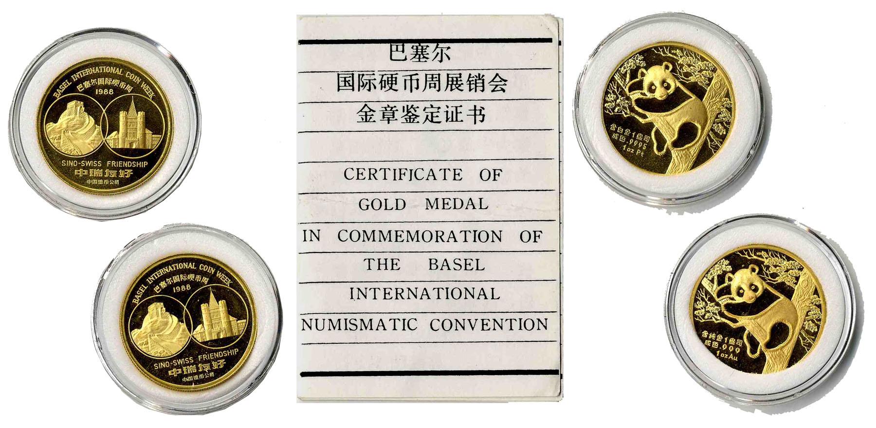1988 Chinese 1oz. Gold Basel Panda Error Set -- Error ''Pt'' Instead of ''Au'' on One Coin -- With Certificates of Authenticity -- Small Red Spots to Both Coins