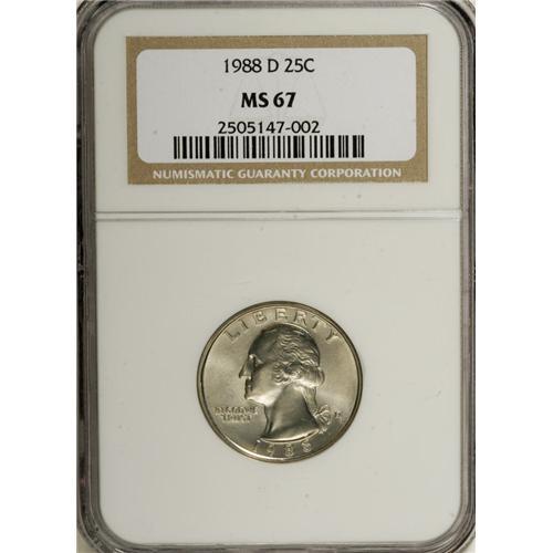 <B>1988-D 25C MS67 NGC.</B></I> Untoned surfaces yield radiant luster and exquisitely struck design elements. Both sides are immaculately preserved. Census: 5 in 67, 0 finer (3/07).<BR><BR><b>Shipping:</b> Coins & Currency (<a target="_blank" href="http://www.heritageauctions.com/common/shipping.php">view shipping information</a>)