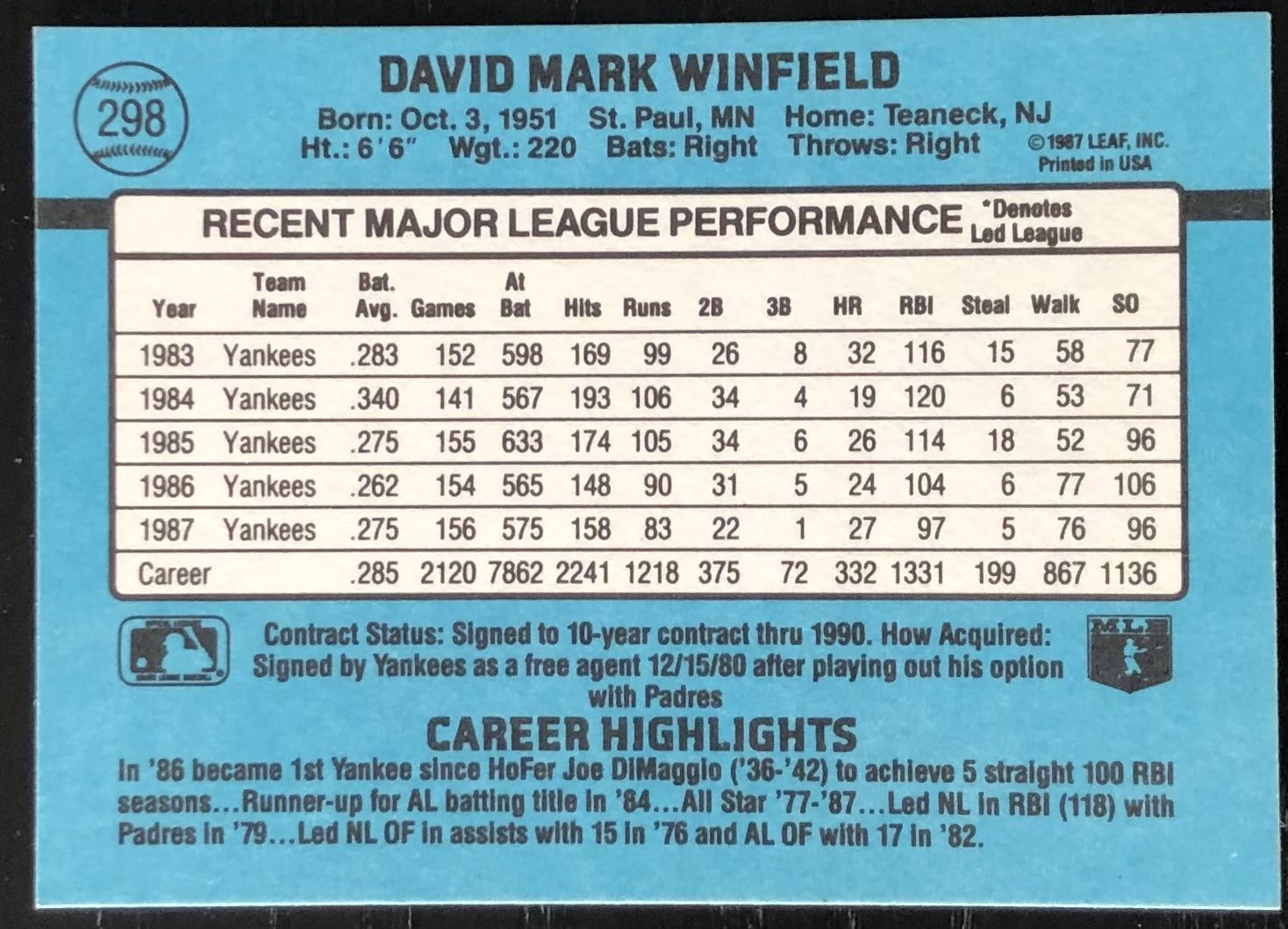 Card #298 MLB, baseball, hall of fame