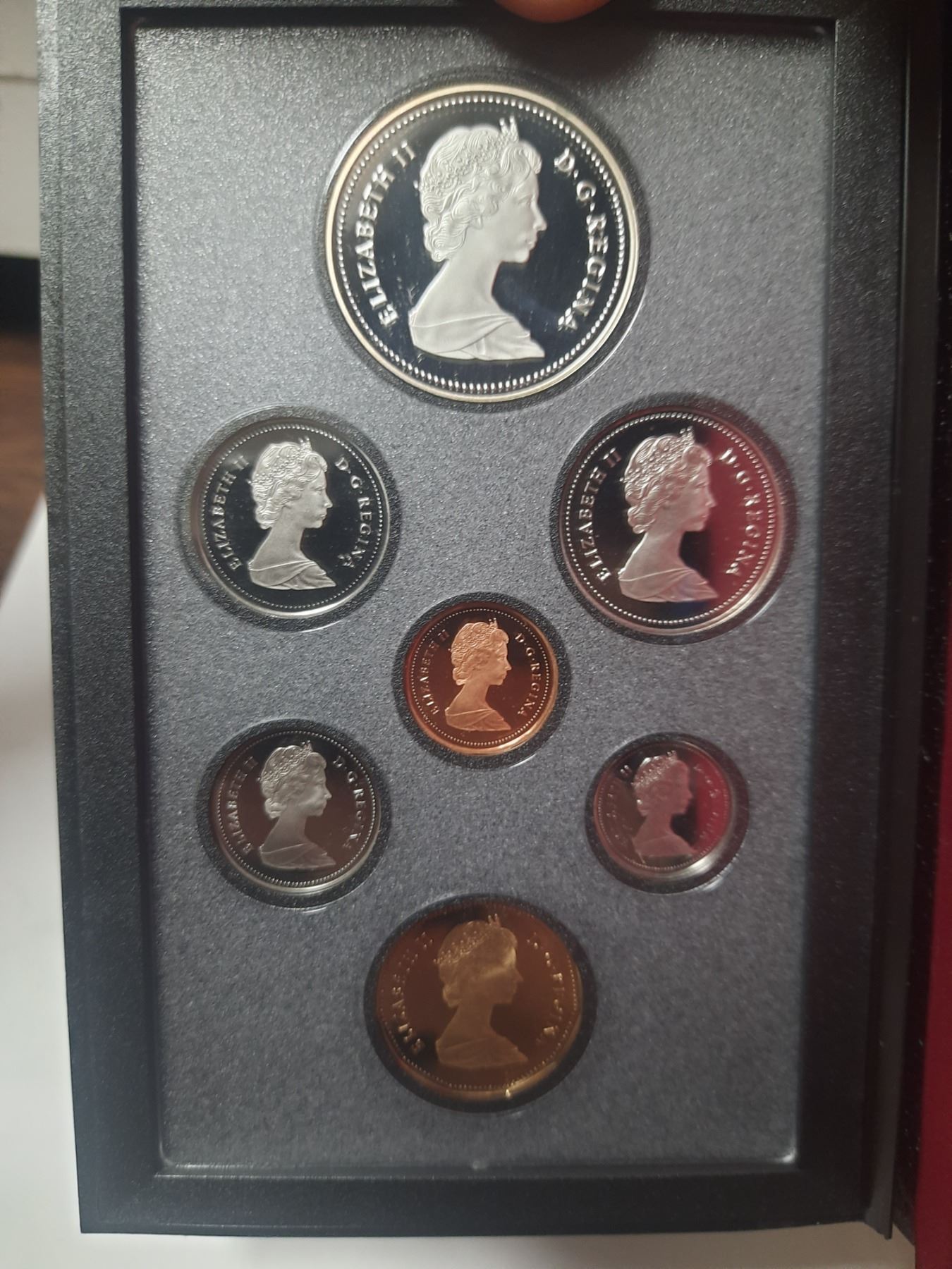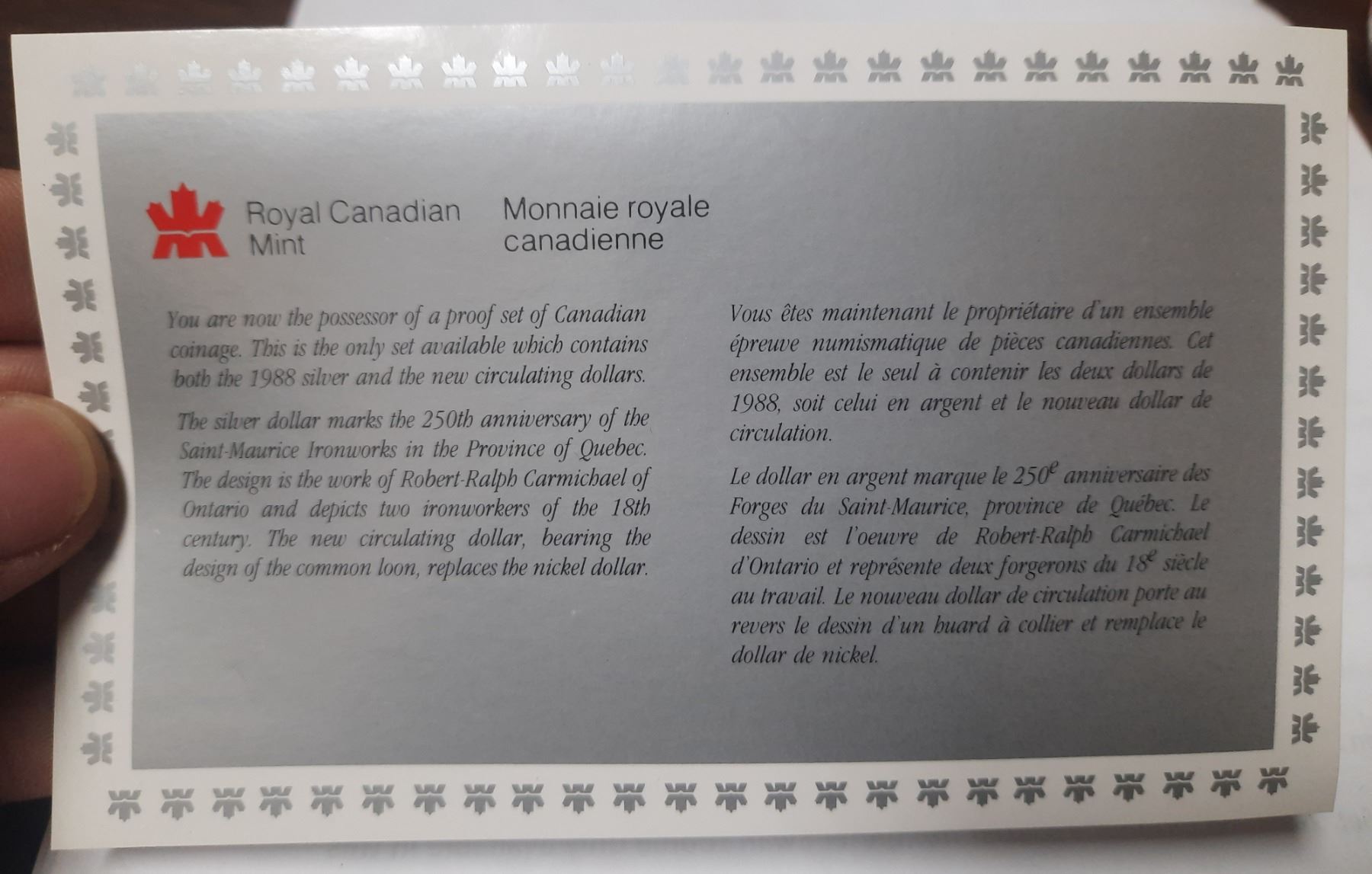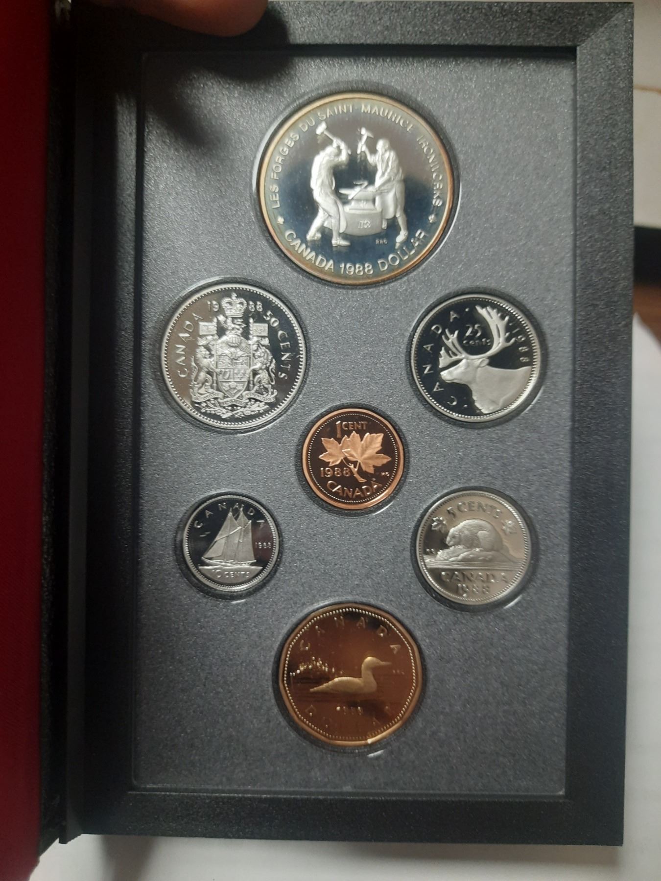 1988 Double Dollar Proof Set. 7-coin set includes a Silver Dollar that commemorates the 250th Anniversary of the first heavy industry in Canada. Proof with Ultra Heavy Cameos.