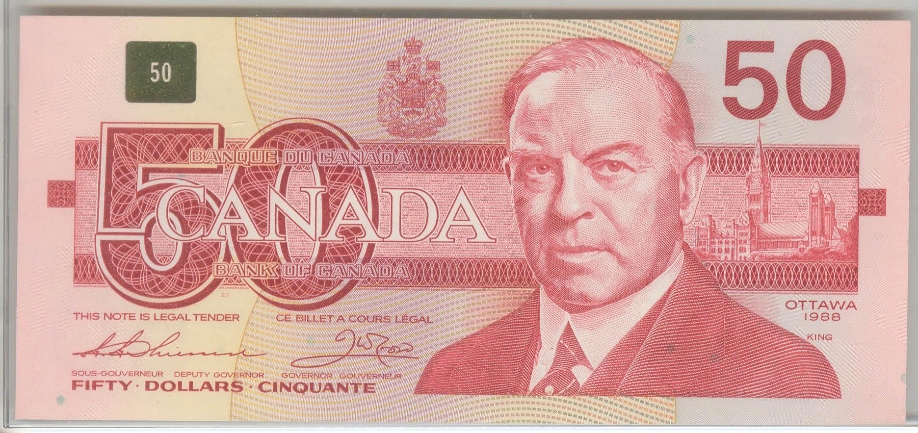 1988 Fifty Dollars Replacement, BC-59aA, CCGS UNC-65 in hard casing, Thiessen Crow, serial EHX3051761 above 2.1m.