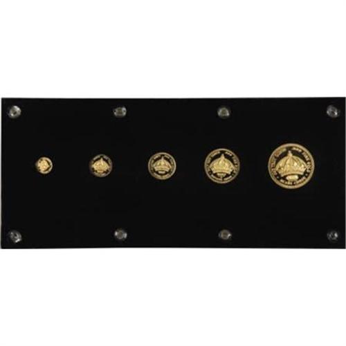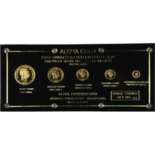 <B>1988 Five-Piece Set of .999 Fine Gold Set #011 Trial Strike.</B></I> Gold, 1988 five-piece set of <B>proof gold </B></I>1 oz, 1/2 oz, 1/4 oz, 1/10 oz and 1/20th oz bullion issued by the Royal Hawaiian Mint. This set is number <B>11 of 88 sets produced</B></I> and comes with a certificate of authenticity signed by Bernard Von Nothaus-Mintmaster.<B> </B></I>The set is housed in a hard plastic holder showing this set is a trial strike with the serial number 011. The total weight of gold in this set is 1.9 oz pure. <BR><BR><b>Shipping:</b> Coins & Currency (<a target="_blank" href="http://www.heritageauctions.com/common/shipping.php">view shipping information</a>)