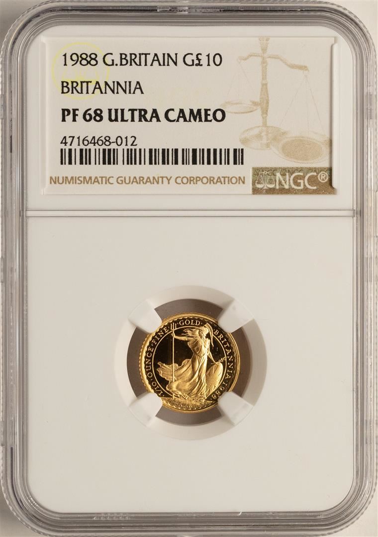 One 1988 Great Britain 10 Pound Britannia Gold Coin NGC PF68 Ultra Cameo. NGC Certified.