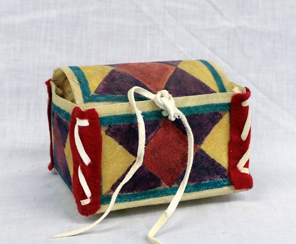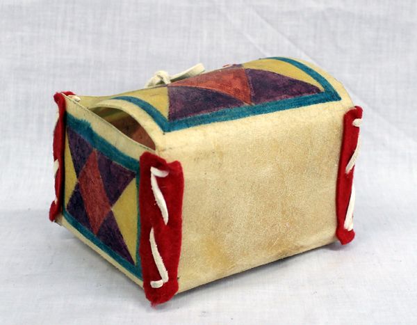1988 Handpainted Parfleche possible Box made by artist Lloyd B One Star, St. Francis, South Dakota. Purse measures 4'' x 4'' x 5'', features diamond and triangle designs, sides are stiched with leather and felt, leather string closure. Called a possible box, bag because the bag could hold possibly anything. Signed on the inside of the purse.