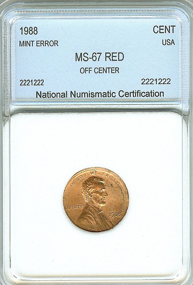 1988 LINCOLN MEMORIAL CENT -OFF CENTER MINT ERROR- NNC MS-67 RED