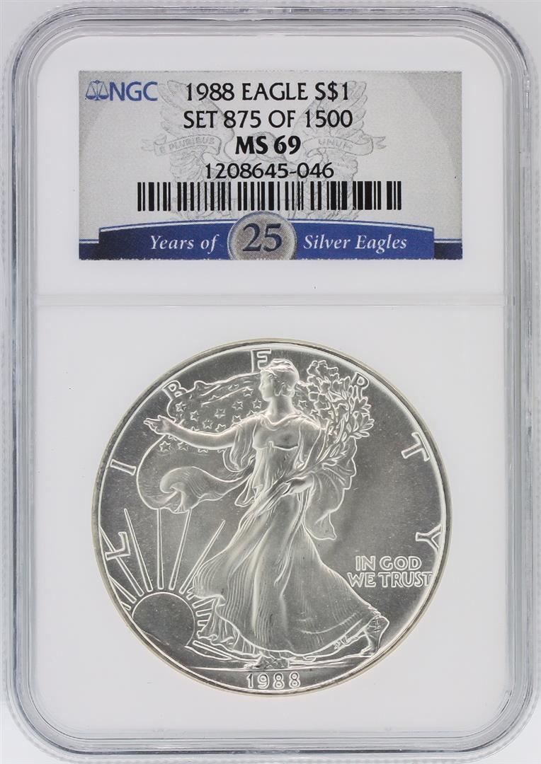 One 1988 NGC MS69 American Silver Eagle Dollar. NGC Certified.