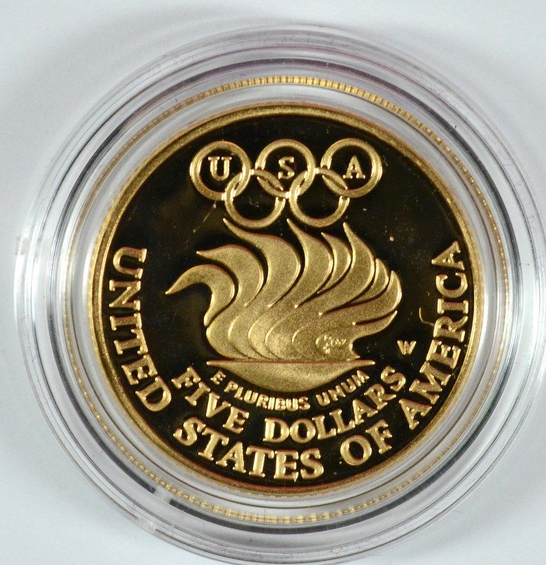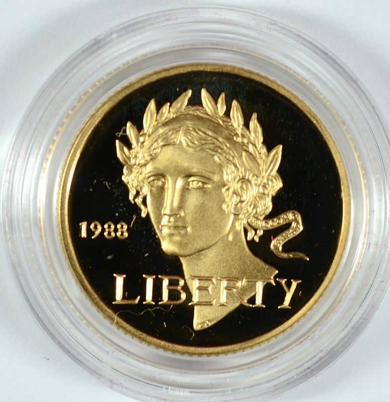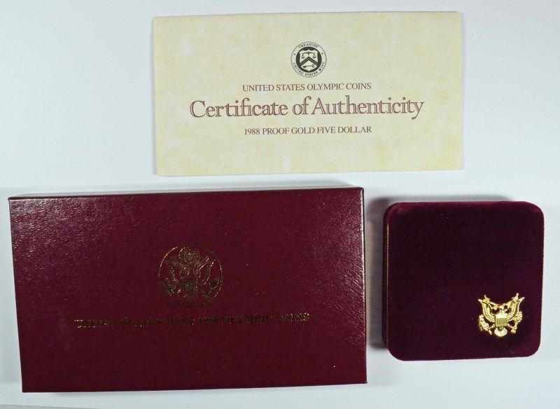 1988 OLYMPIC $5.00 PROOF COMMEMORATIVE GOL, IN ORIGINAL BOX WITH CERTIFICATE
