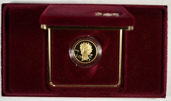 A BEAUTIFUL PROOF FIVE DOLLAR GOLD COMMEMORATIVE IN EXEPTIONALLY NICE PACKAGING WITH CERTIFICATE, EST. $470.00 TO $500.00