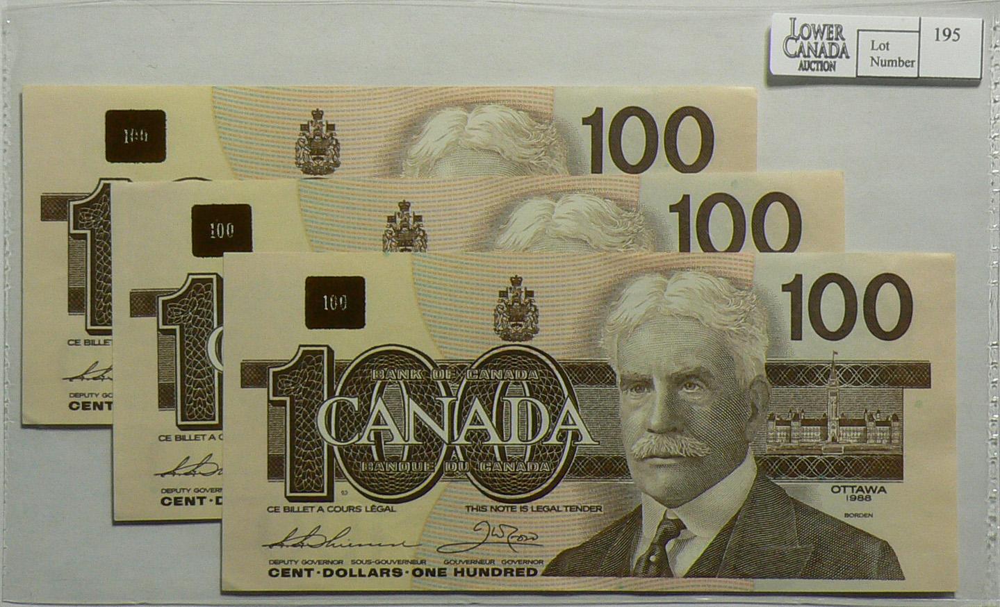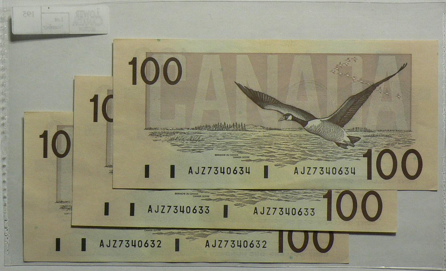 1988, One Hundred Dollars, BC60a-i, 3 Consecutive notes, UNC, Thiessen Crow, serials AJZ73440632, 633, 634