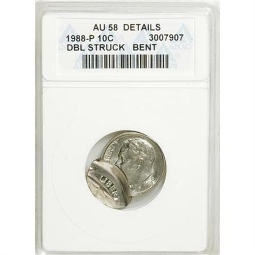 <B>1988-P 10C Roosevelt Dime--Bent, Double Struck --ANACS. AU58 Details.</B></I> <BR><BR><B>Coin Engraver:</B> John R. Sinnock<BR><BR><b>Shipping:</b> Coins & Currency (<a target="_blank" href="http://www.heritageauctions.com/common/shipping.php">view shipping information</a>)