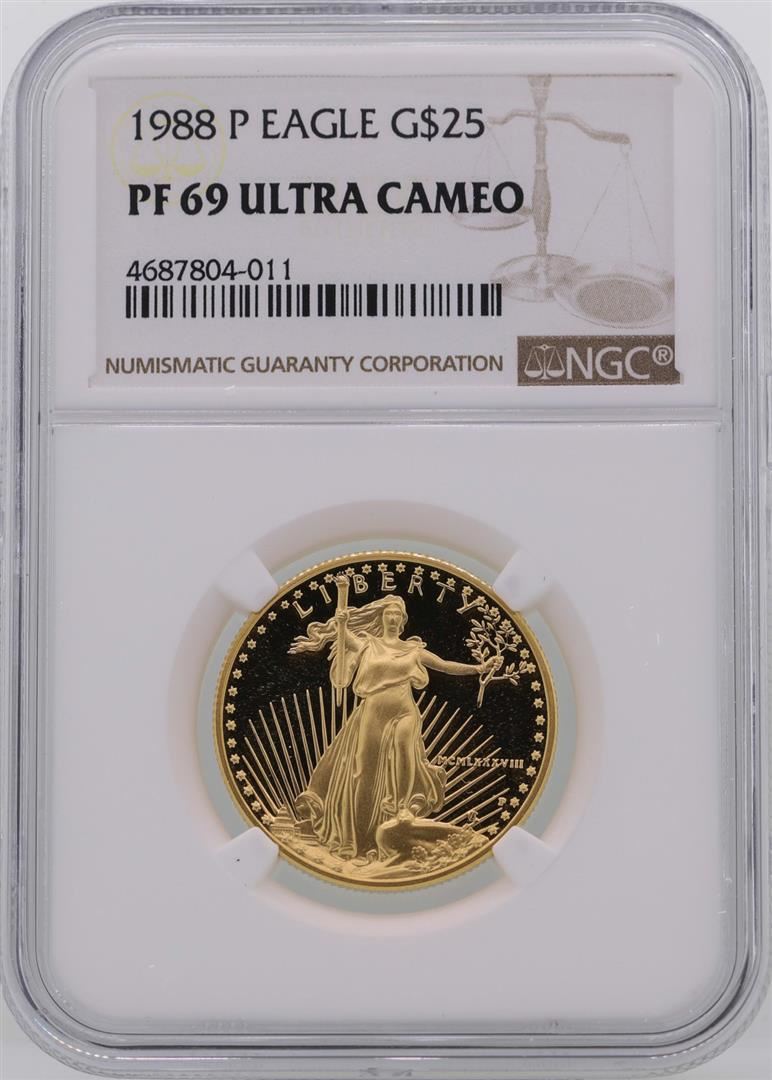 One 1988-P $25 American Gold Eagle Coin NGC PF69 Ultra Cameo. NGC Certified.