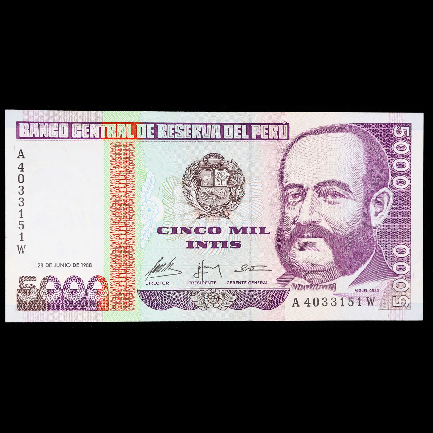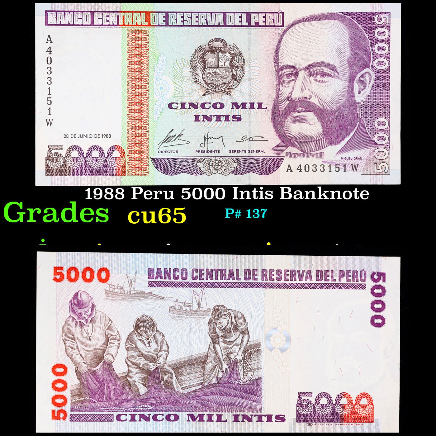 1988 Peru 5000 Intis Banknote Grades Gem CU.
