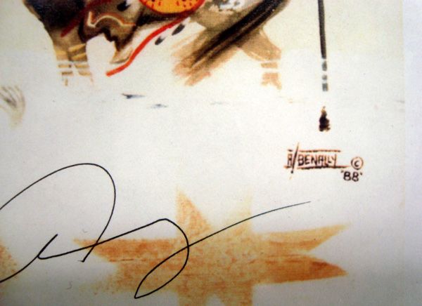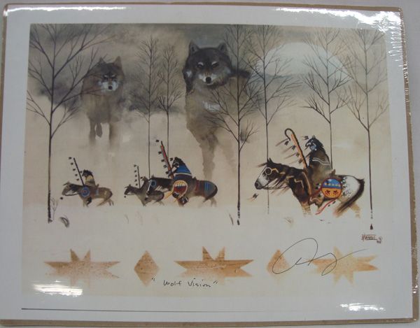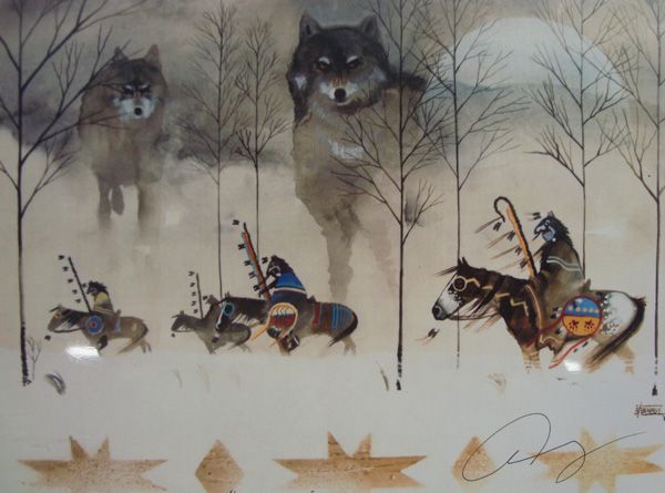 1988 Print ''Wolf Vision'' - Benally. Majestic wolf images tower over Indians traveling horseback in the winter. This print measures 7''H x 10''W.