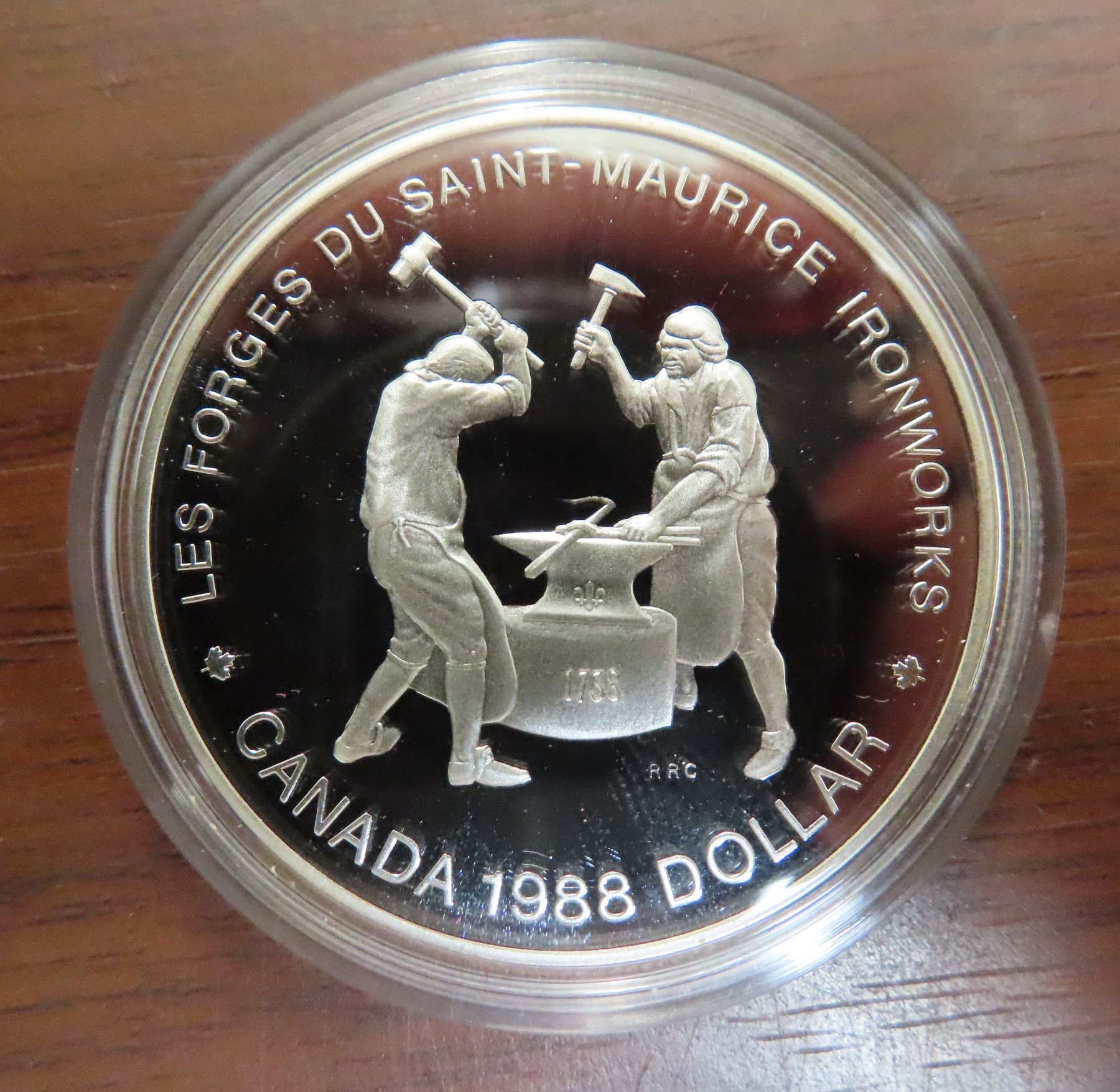 1988 Proof Silver Dollar. Commemorates the first heavy industry in Canada. Housed in its original Royal Canadian Mint case of issue. Bright White.