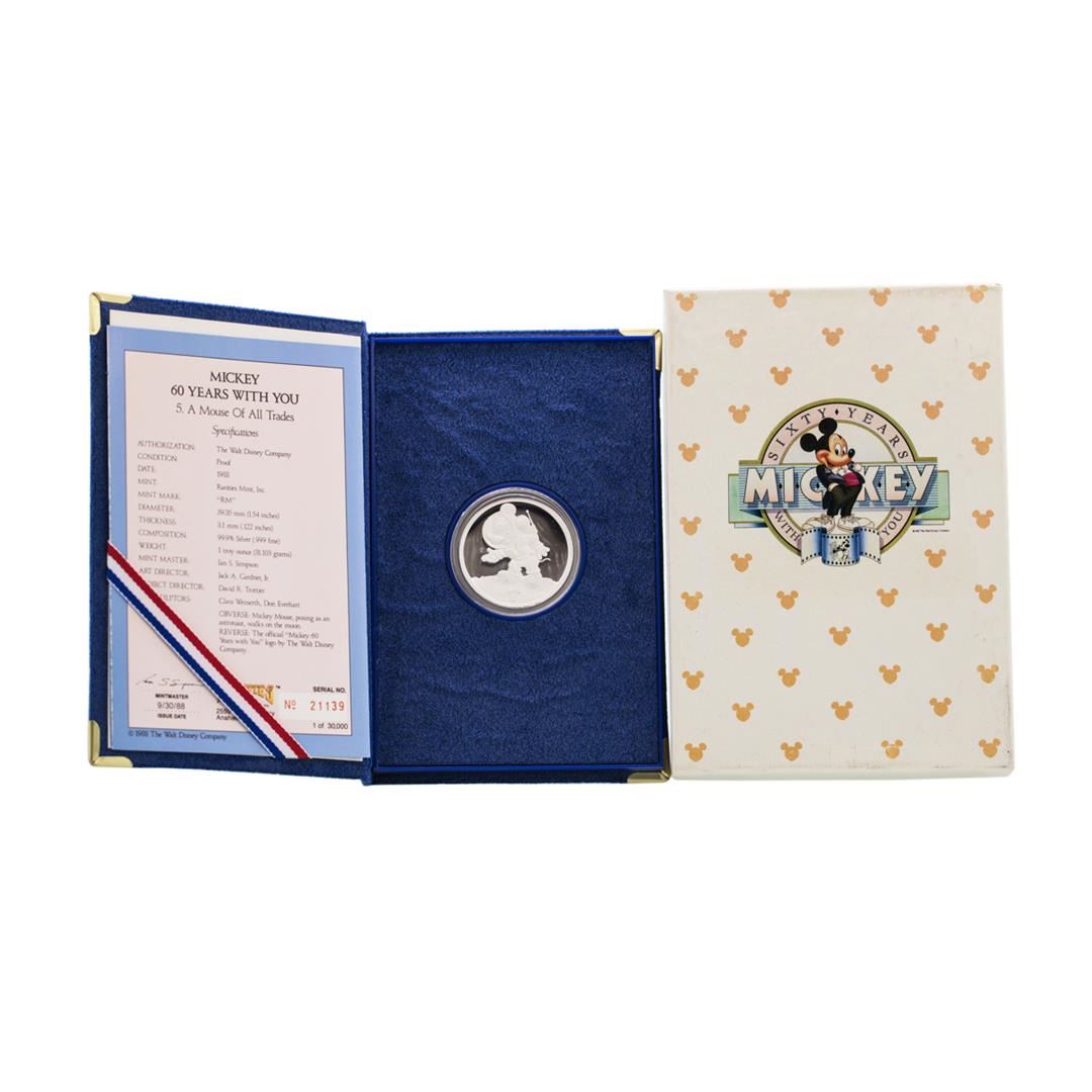 One 1988 Rarities Mint Disney Mickey Mouse Silver Proof Coin w/Box & COA.