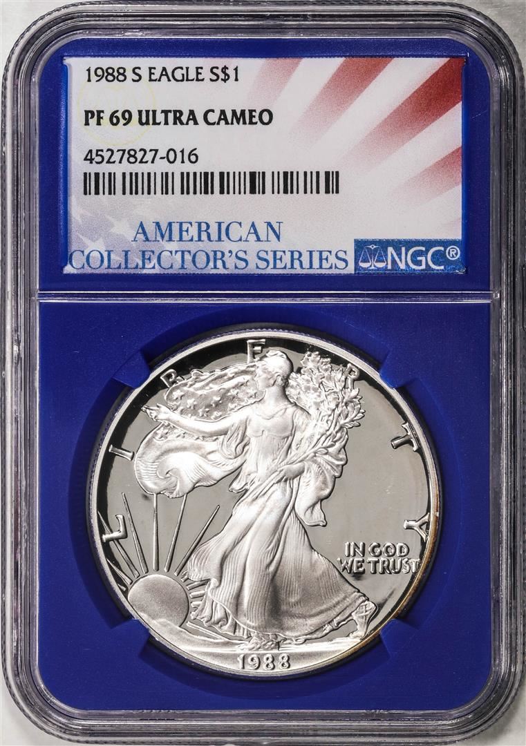 One 1988-S $1 Proof American Silver Eagle Coin NGC PF69 Ultra Cameo. NGC Certified.