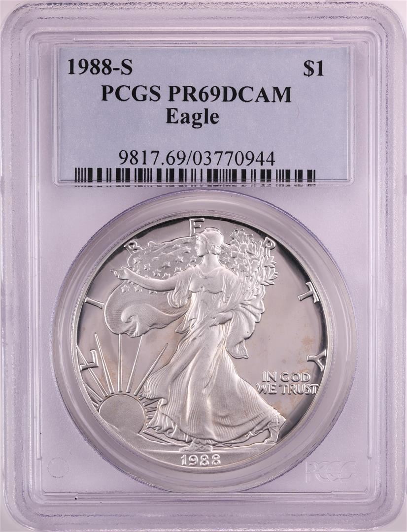 One 1988-S Proof $1 American Silver Eagle Coin PCGS PR69DCAM. PCGS Graded.