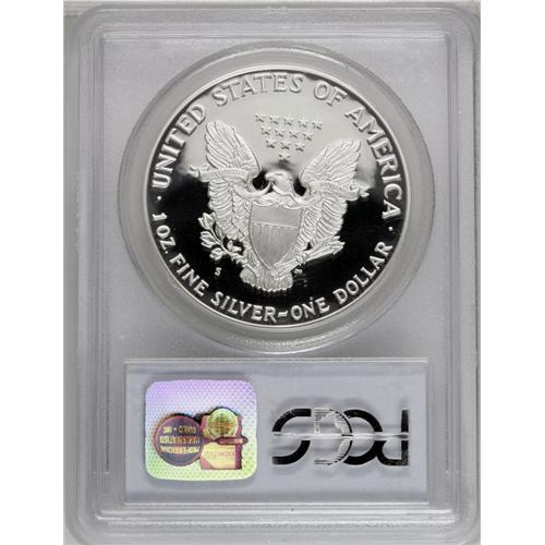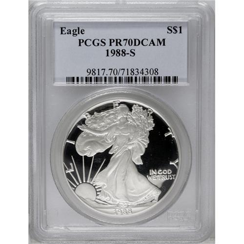 <B>1988-S<img border='0' src='http://www.heritagecoins.com/images/star.gif' width=10 height=10>$1> Silver Eagle PR70 Deep Cameo PCGS.</B></I> A black and white proof in perfect condition. Population: 26 in 70 (4/06).