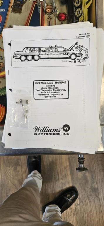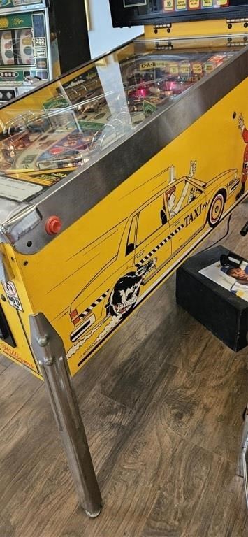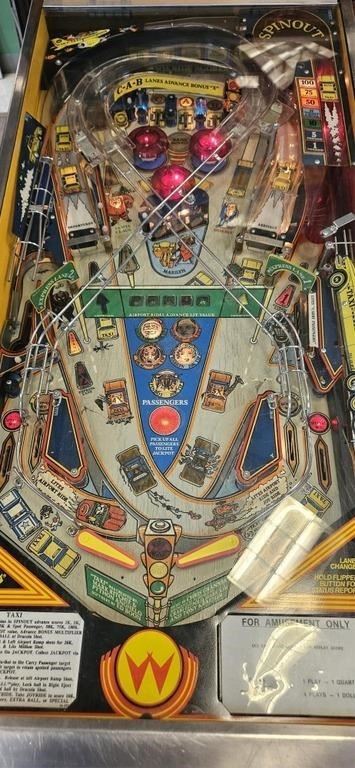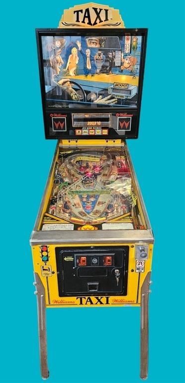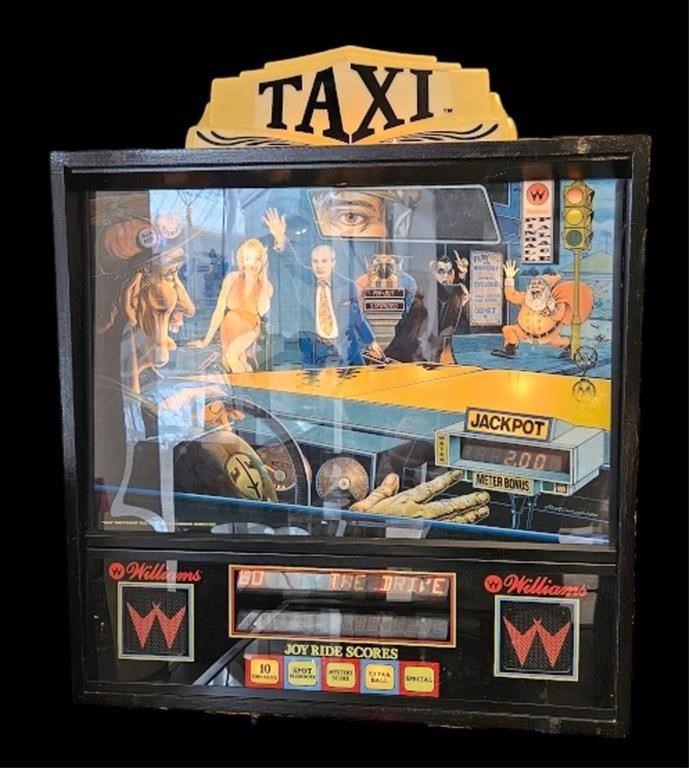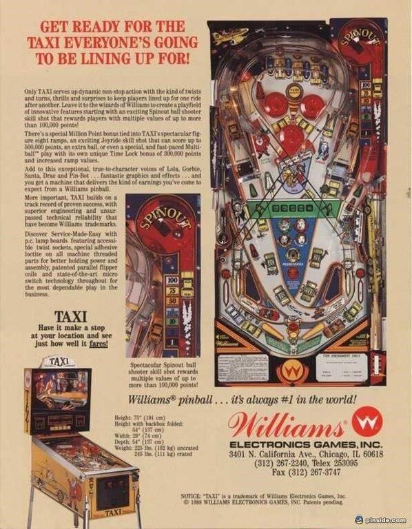 1988 taxi #10 Williams electronic pinball machine. This pinball machine was made by Concept: Mark Ritchie Python Anghelo Game Design: Mark Ritchie Mechanics: Tony Kraemer Software: Ed Boon Artwork: Python Anghelo Sound: Chris Granner Callouts: Barry Oursler Chris Granner Mark Ritchie Steve Ritchie. NOTEWORTHY FEATURES: