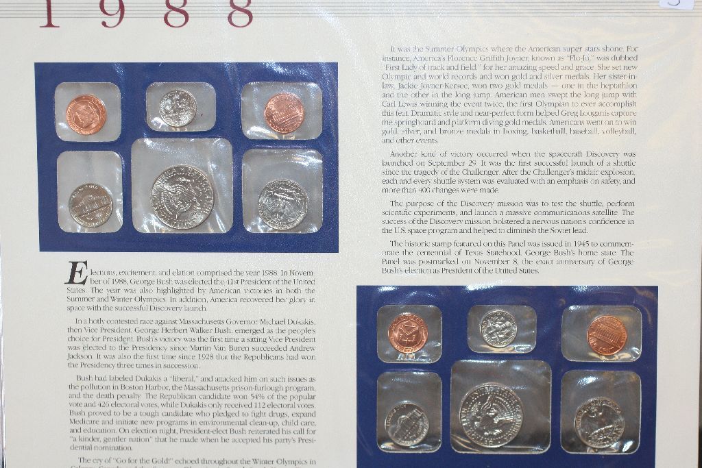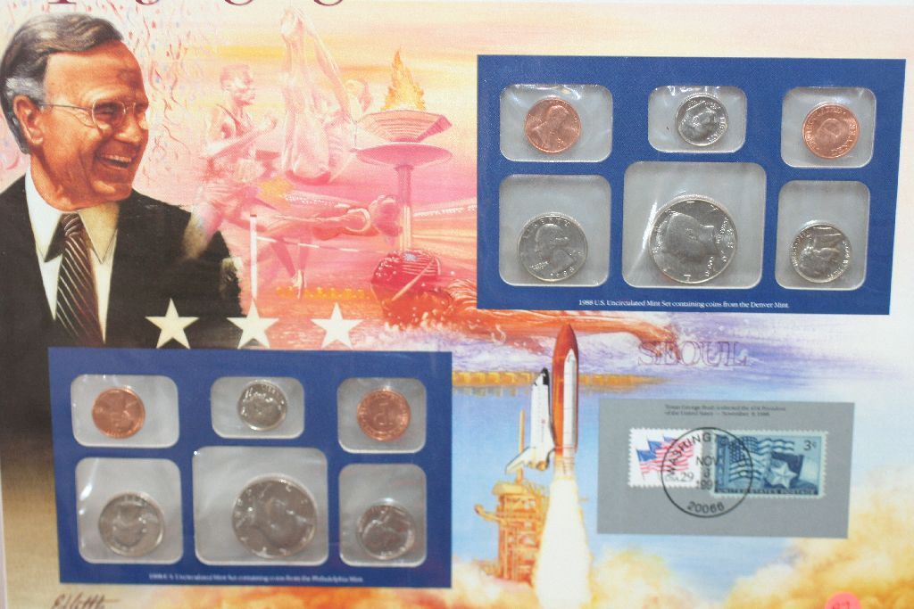1988 US Mint Coin Set W/Postal Stamps Commerating Texan George Bush Elected President Dated 1991; P&D Mints; UNC