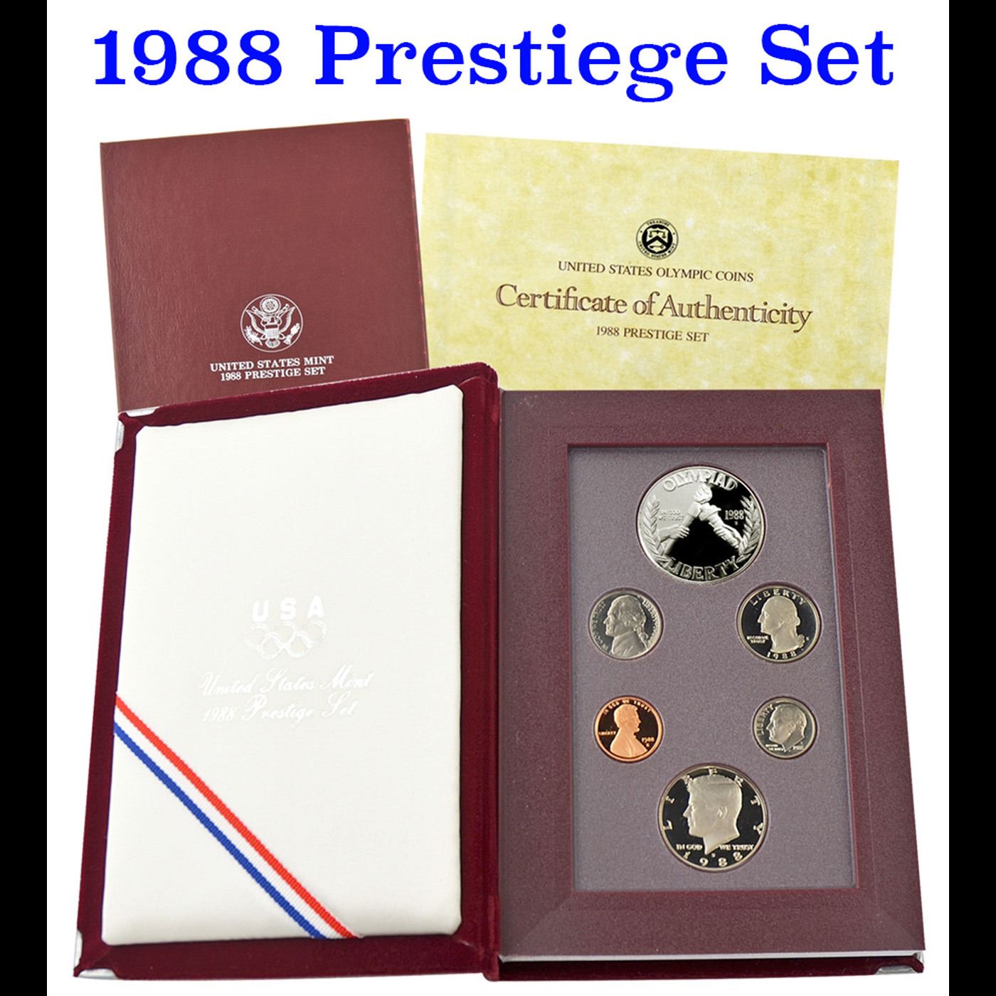 1988 United States Mint Prestige Proof Set. Contains the 1988 Olympic Torch 90% silver US Silver Dollar plus the Traditional 5 pieces 1988 Proof Set. Includes all the original packaging and the COA. Note* The silver Dollar alone has .7736 Oz. of pure silver.