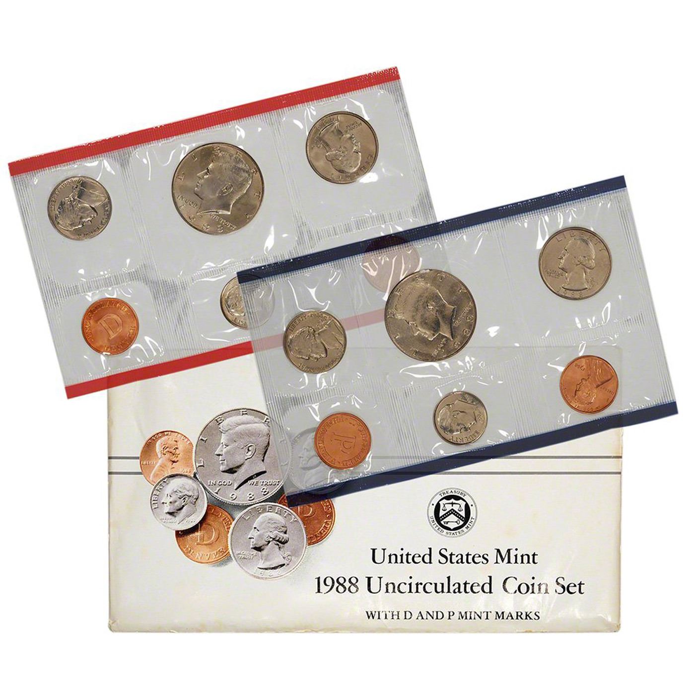 1988 United States Mint Set in Original Government Packaging, 10 Coins Inside!. This 1988 U.S. Mint Set contains brilliant uncirculated examples of the cent, nickel, dime, quarter and half dollar from the Philadelphia and Denver mints.Product Highlights:Contains examples of the following coins from both Philadelphia and Denver mints: Lincoln cent, Jefferson nickel, Roosevelt dime, Washington quarter and Kennedy half dollar.Coins protected from the mint in cellophane packaging to ensure they remain in brilliant uncirculated condition.