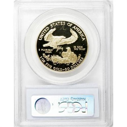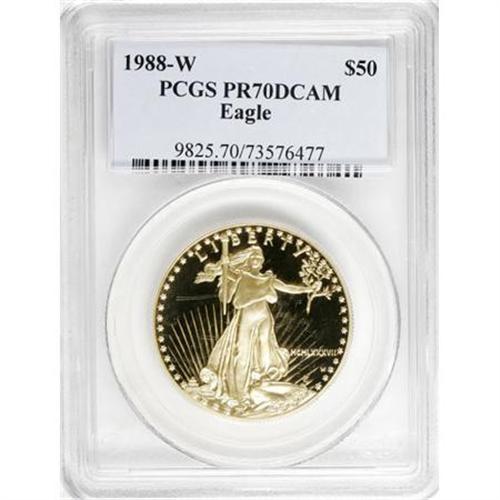 <B>1988-W G$50 One-Ounce Gold Eagle PR70 Deep Cameo PCGS.</B></I> A technically perfect modern Mint masterpiece, gleaming with undeniable black-and-gold contrast between the fathomless fields and the richly frosted devices. One of just 80 specimens for the issue so graded by PCGS (12/07).<BR><BR><b>Shipping:</b> Coins & Currency (<a target="_blank" href="http://www.heritageauctions.com/common/shipping.php">view shipping information</a>)