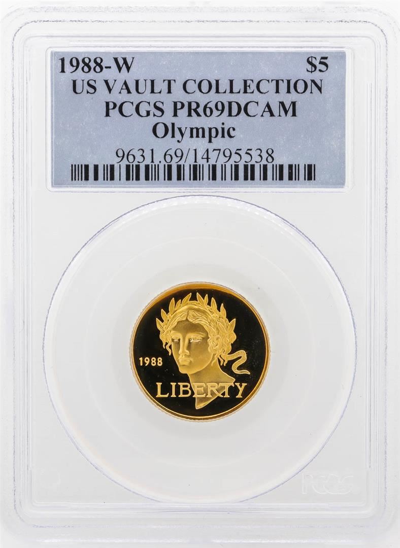 One 1988-W PCGS PR69DCAM US Vault Collection $5 Olympic Gold Coin.