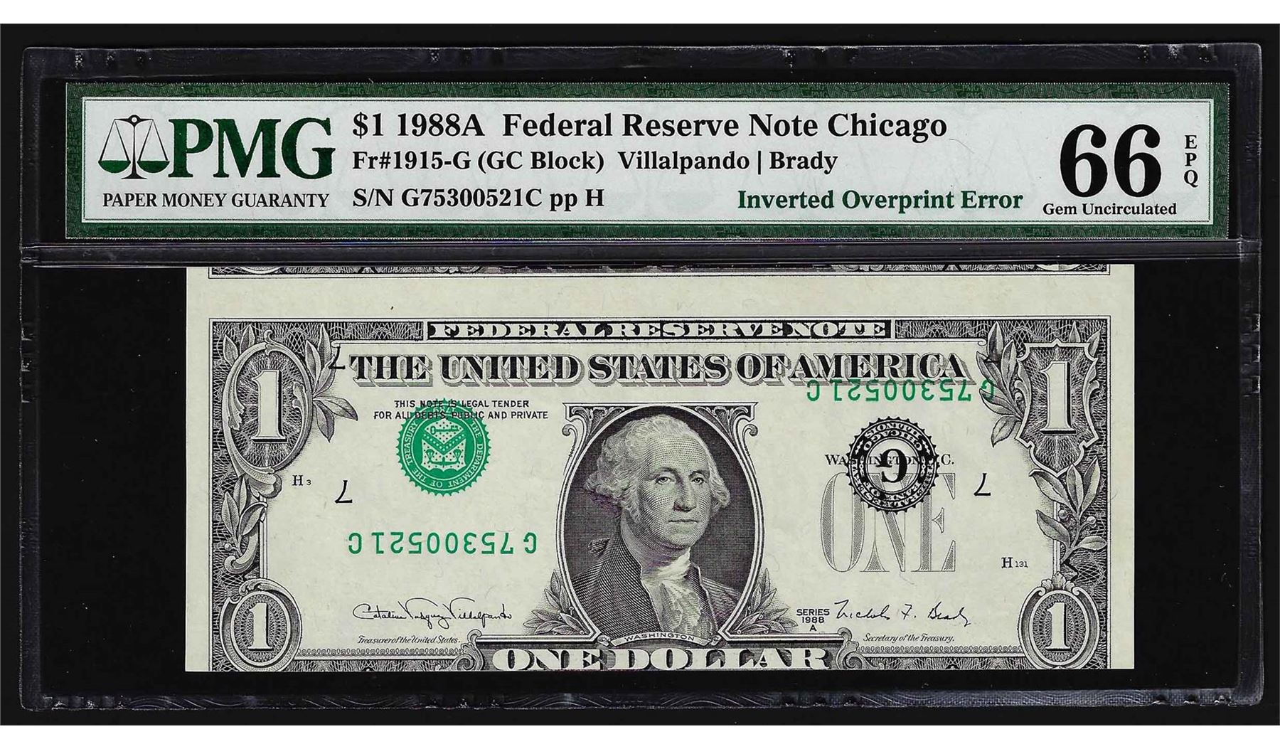 One 1988A $1 Federal Reserve Note ERROR Inverted Overprint Error PMG 66EPQ. PMG Certified.