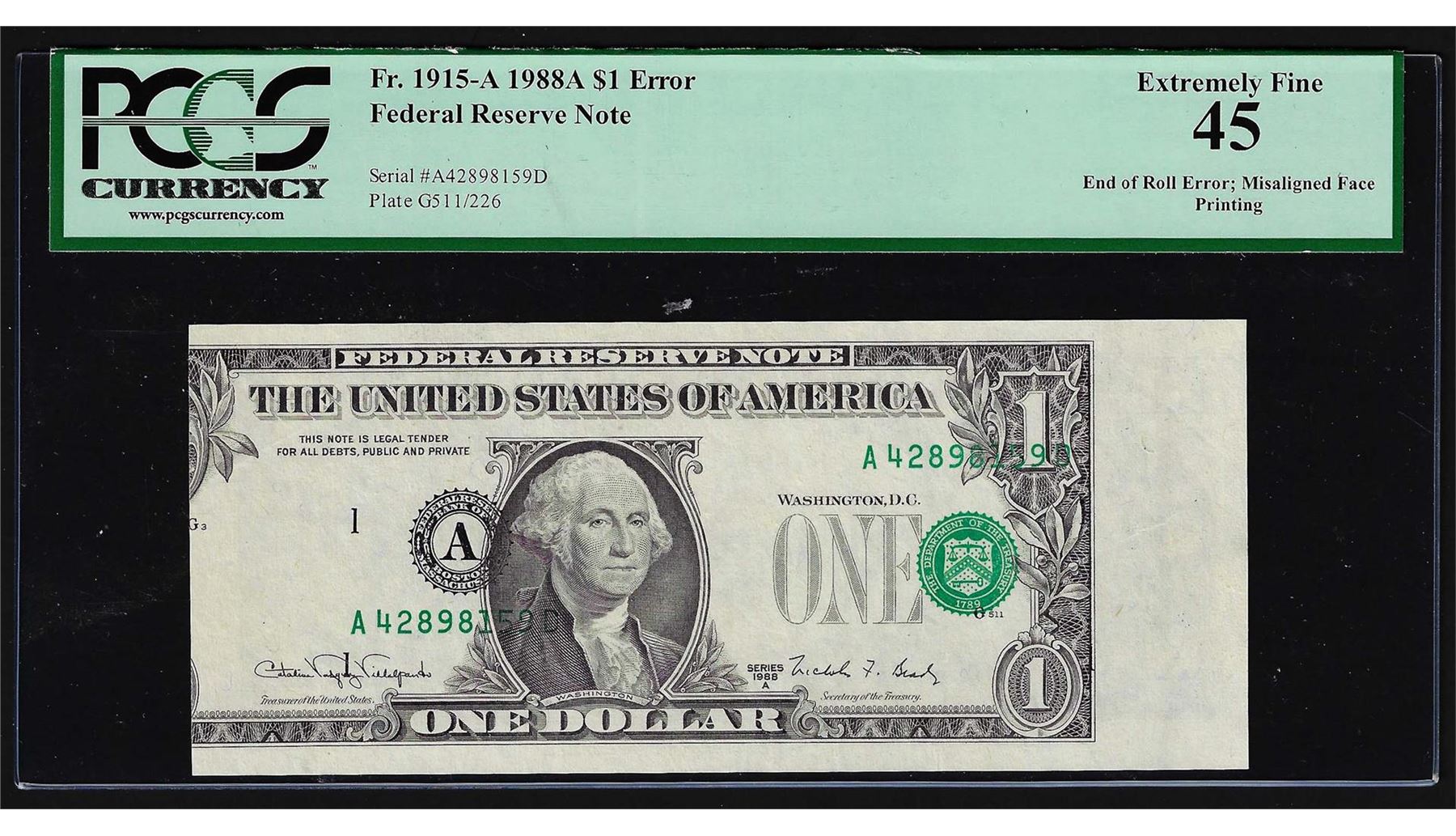 One 1988A $1 Federal Reserve Note Misaligned Face ERROR PCGS XF45. PCGS Graded.