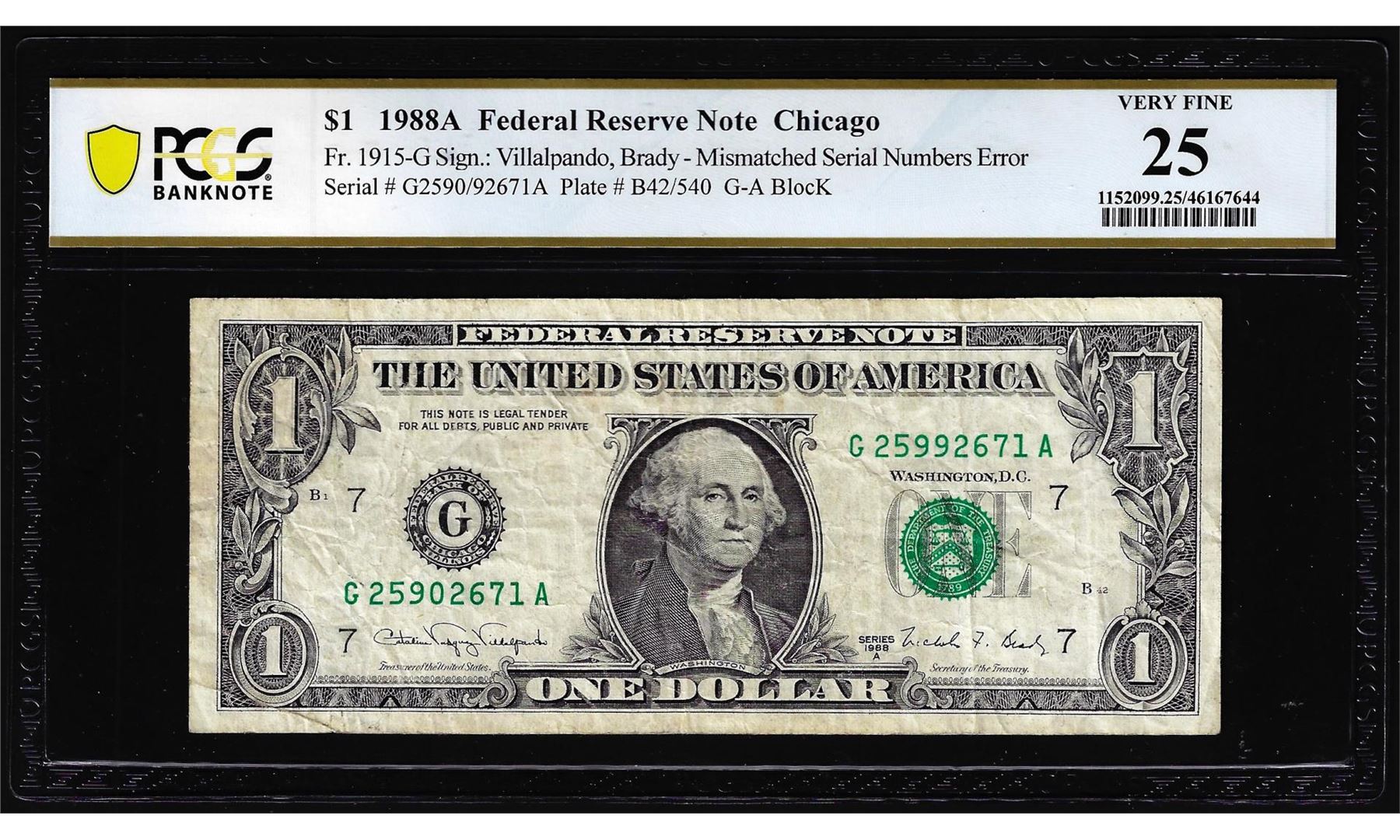 One 1988A $1 Federal Reserve Note Mismatched Serial Number Error Fr.1915-G PCGS Very Fine 25. PCGS Graded.