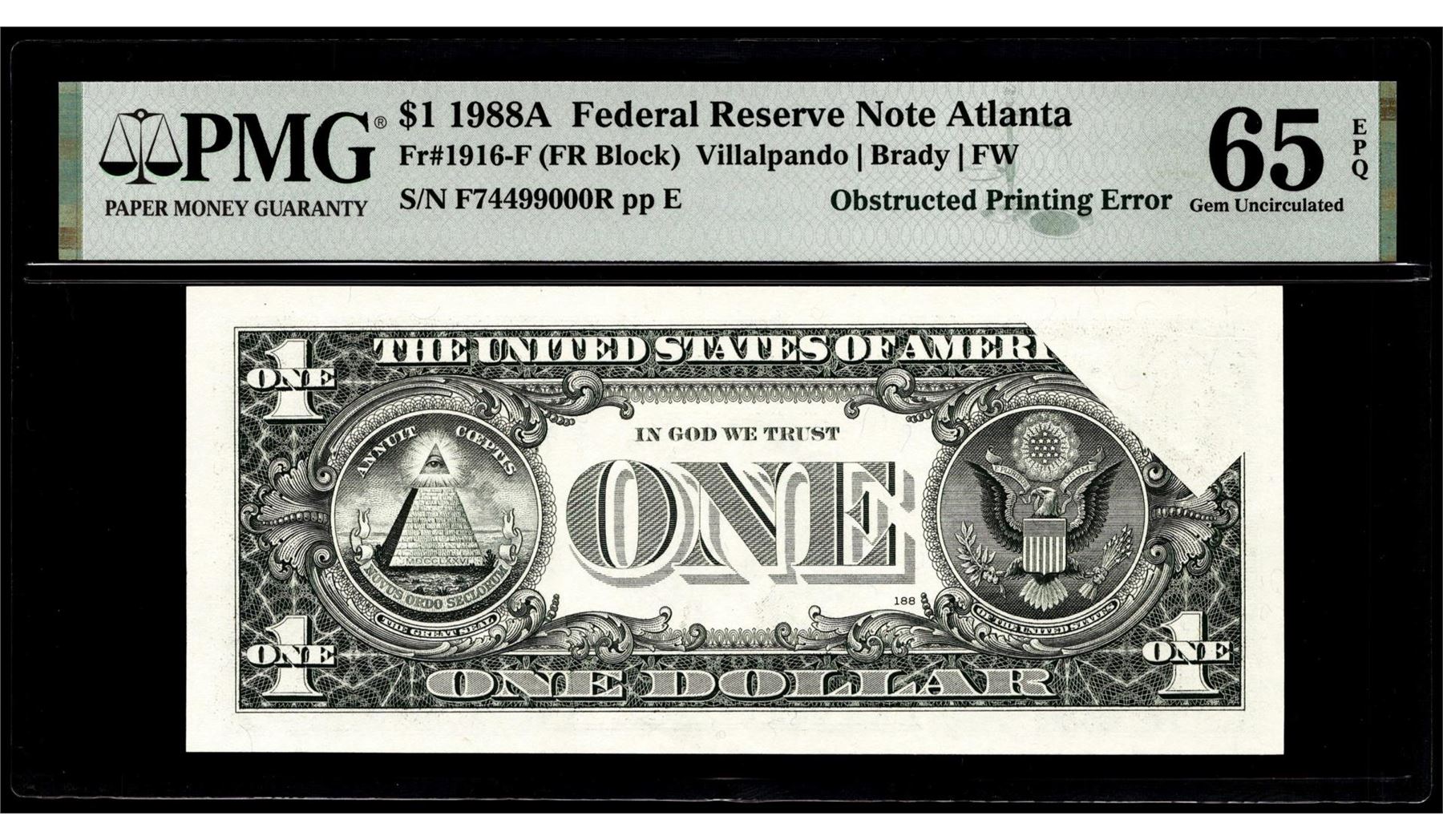 One 1988A $1 Federal Reserve Obstructed Printing Error Note PMG Gem Uncirculated 65EPQ. PMG Certified.