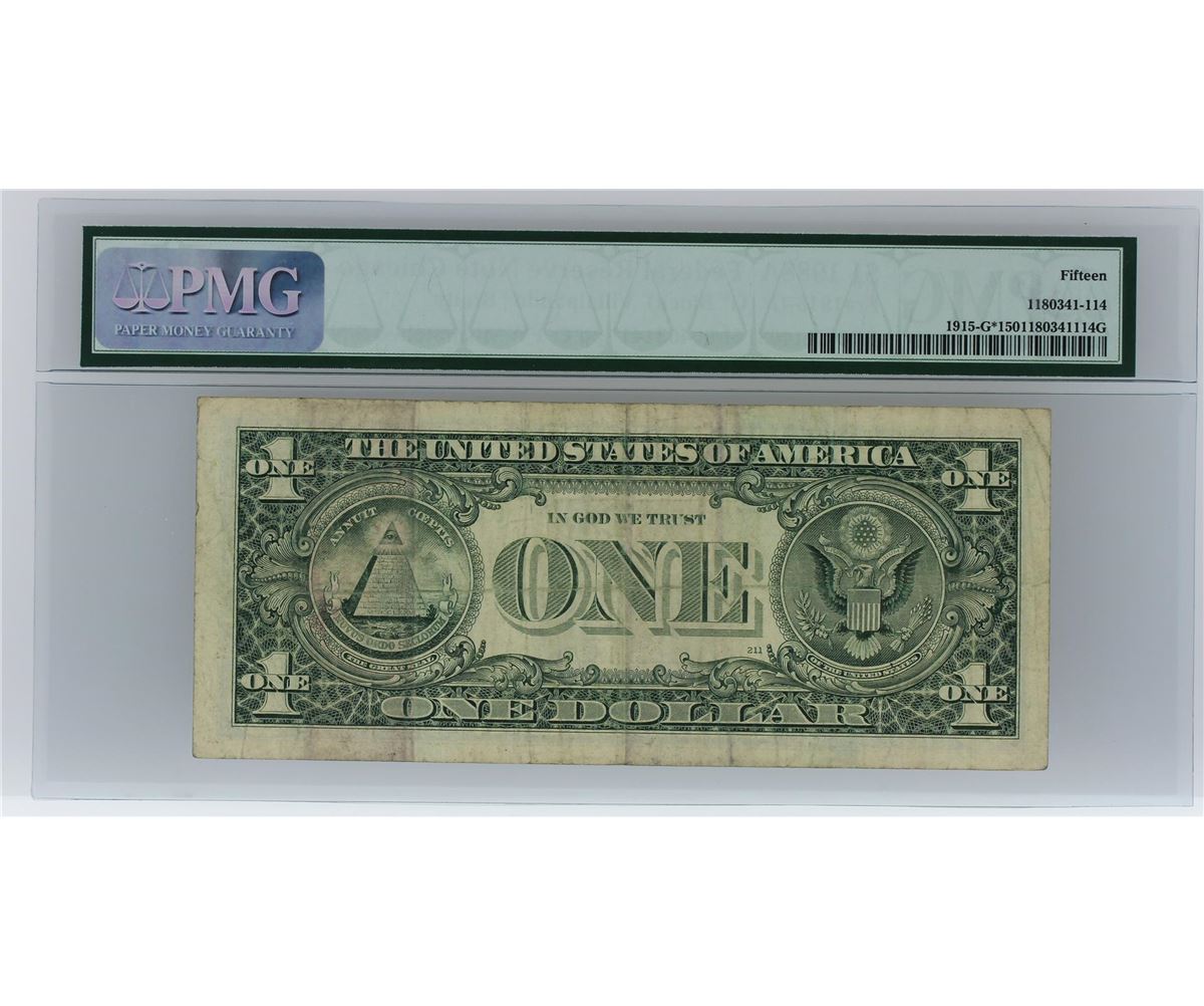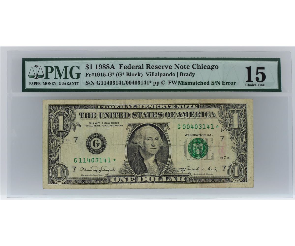 One 1988A $1 Mismatched S/N Error Federal Reserve Note Chicago FR-1915-G* (G* Block) PMG Graded Choice Fine 15. PMG Appraised.