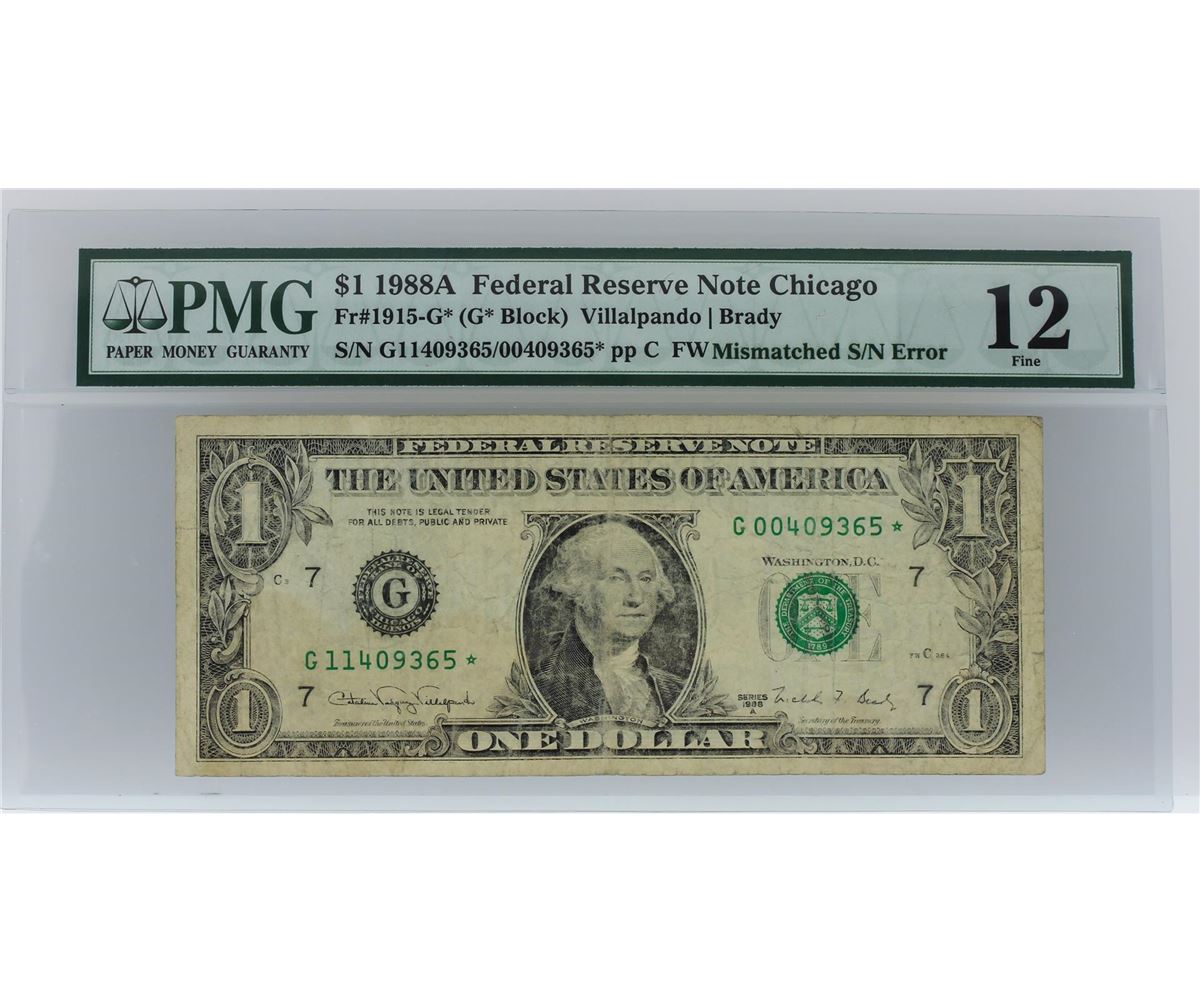 One 1988A $1 Mismatched S/N Error Federal Reserve Note Chicago FR-1915-G* (G* Block) PMG Graded Fine 12. PMG Appraised.