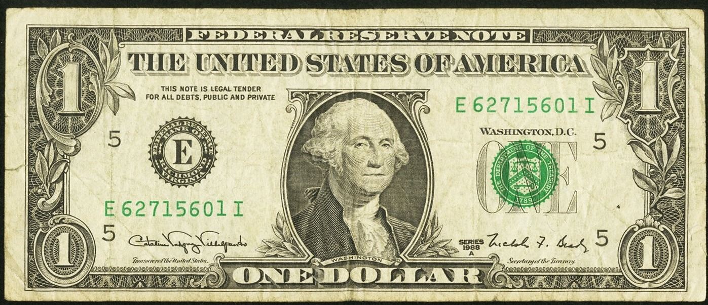 Fr. 1917-E $1 1988A Web Federal Reserve Note. Fine, block E-I, run 10, plate combo 4-7. This is one of the scarcer webs from run 10. A left edge tear barely reaches the frame line.
