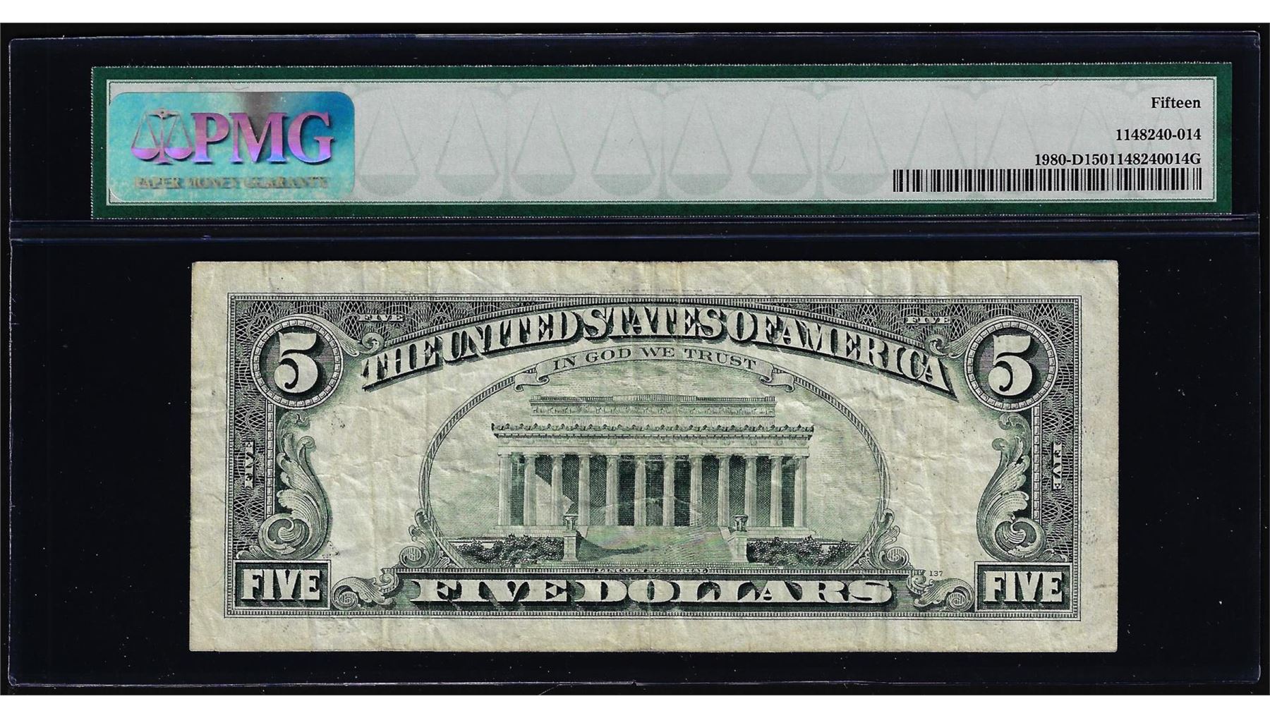 One 1988A $5 Federal Reserve Note Mismatched Serial Number Error Fr.1980-D PMG Ch. Fine 15. PMG Certified.