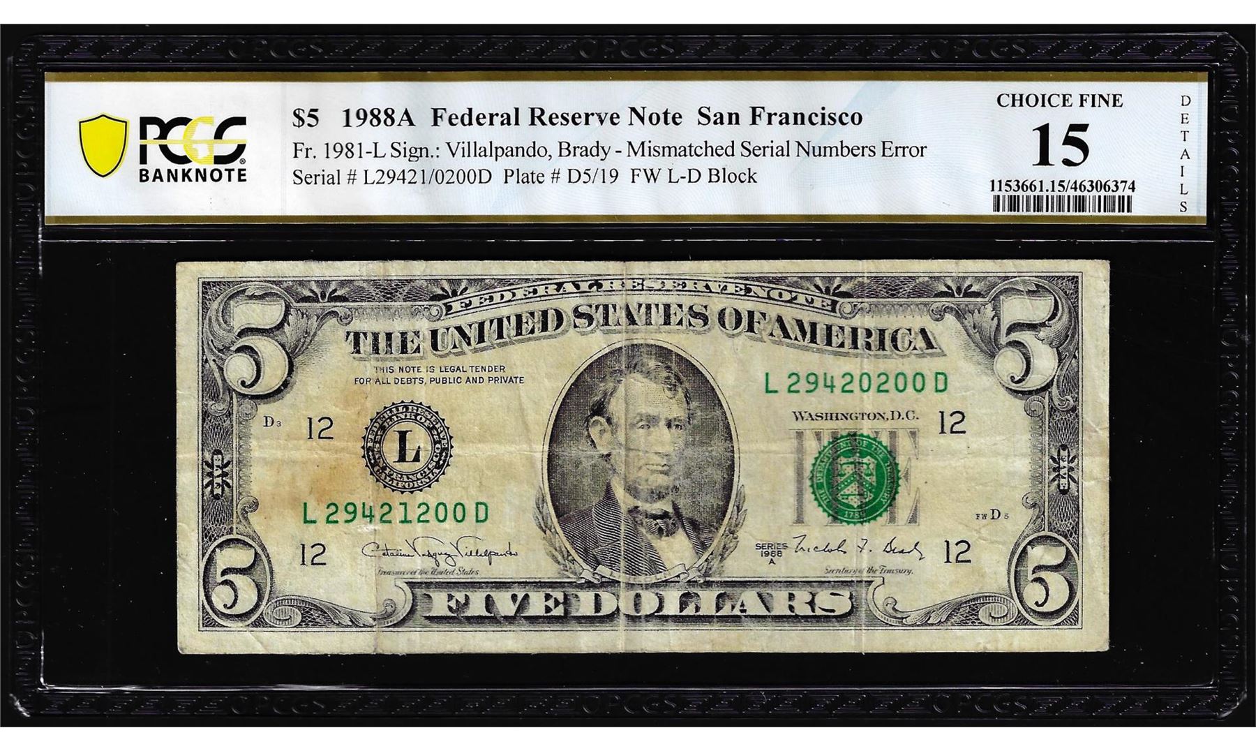 One 1988A $5 Federal Reserve Note Mismatched Serial Number Error PCGS Ch. Fine 15 Details. PCGS Graded.