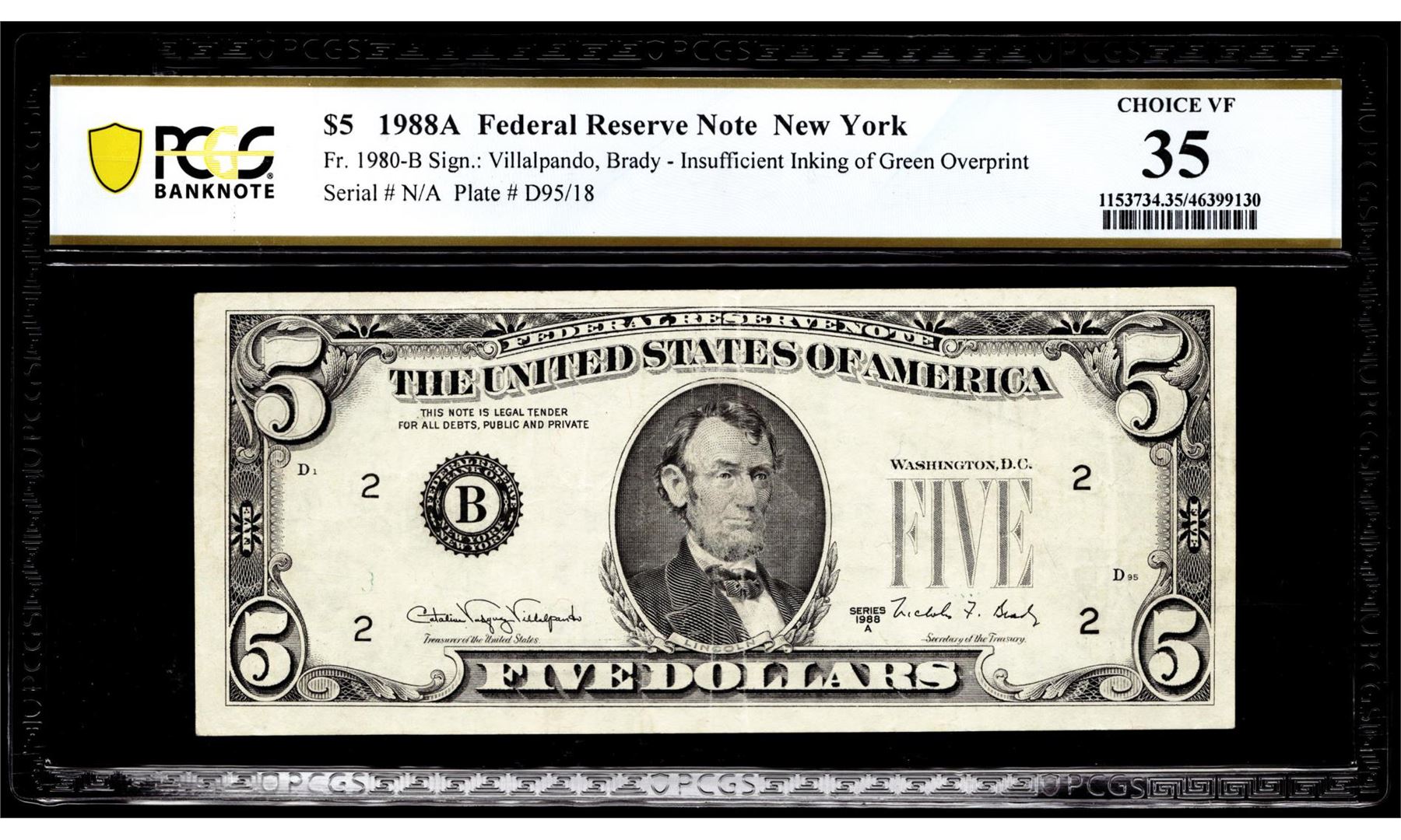 One 1988A $5 Federal Reserve Note New York Insufficient Inking Error PCGS Choice VF 35. PCGS Graded.