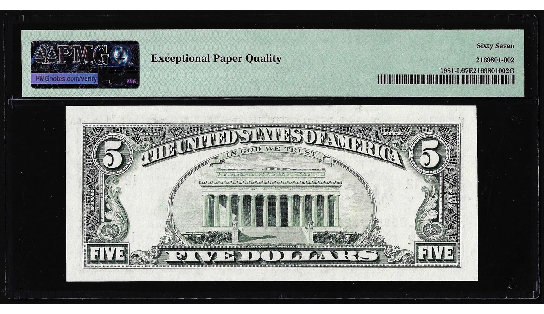 One 1988A $5 Federal Reserve Note San Francisco Fr.1981-L PMG Superb Gem Unc 67EPQ. PMG Certified.