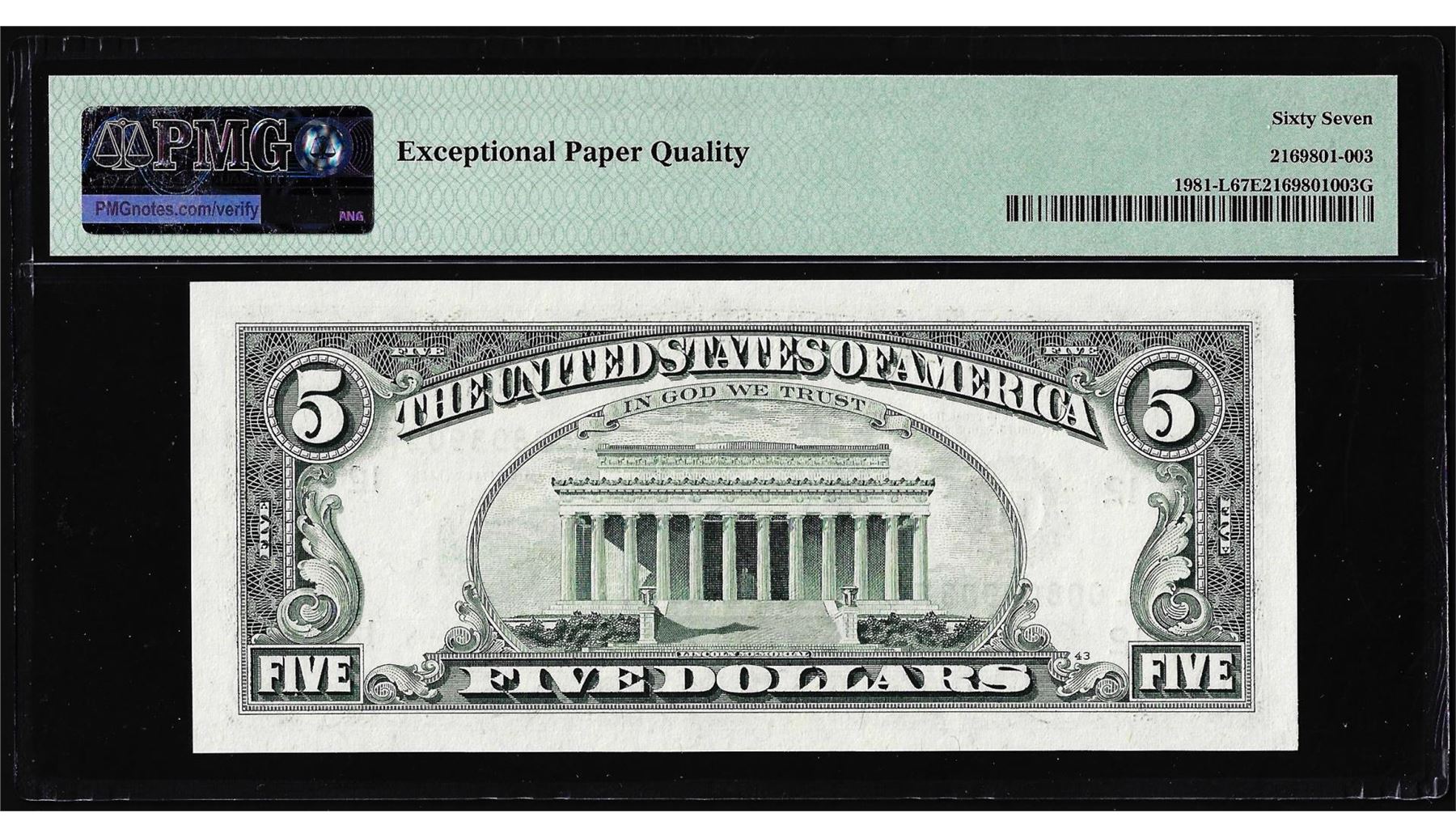 One 1988A $5 Federal Reserve Note San Francisco Fr.1981-L PMG Superb Gem Unc 67EPQ. PMG Certified.